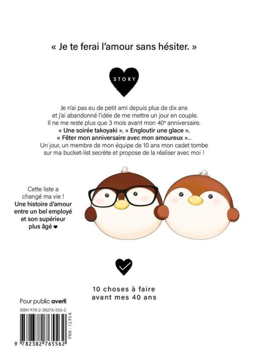 Je n’ai pas eu de petit ami depuis plus de dix ans et j’ai abandonné l’idée de me mettre un jour en couple. Il ne me reste plus que 3 mois avant mon 40e anniversaire. " Une soirée takoyaki ", " Engloutir une glace ", " Fêter mon anniversaire avec mon amoureux "... Un jour, un membre de mon équipe de 10 ans mon cadet tombe sur ma bucket-list secrète et propose de la réaliser avec moi !