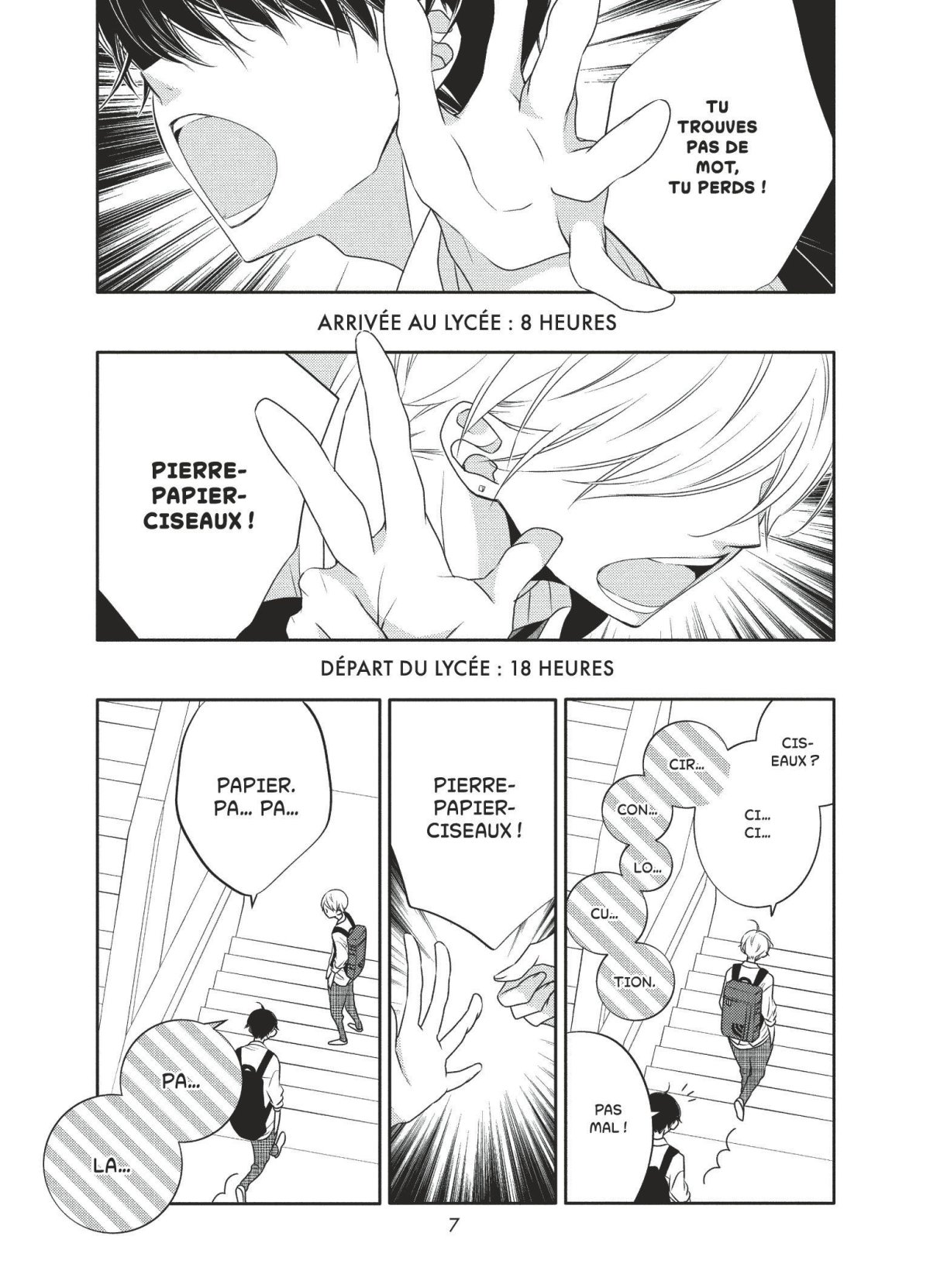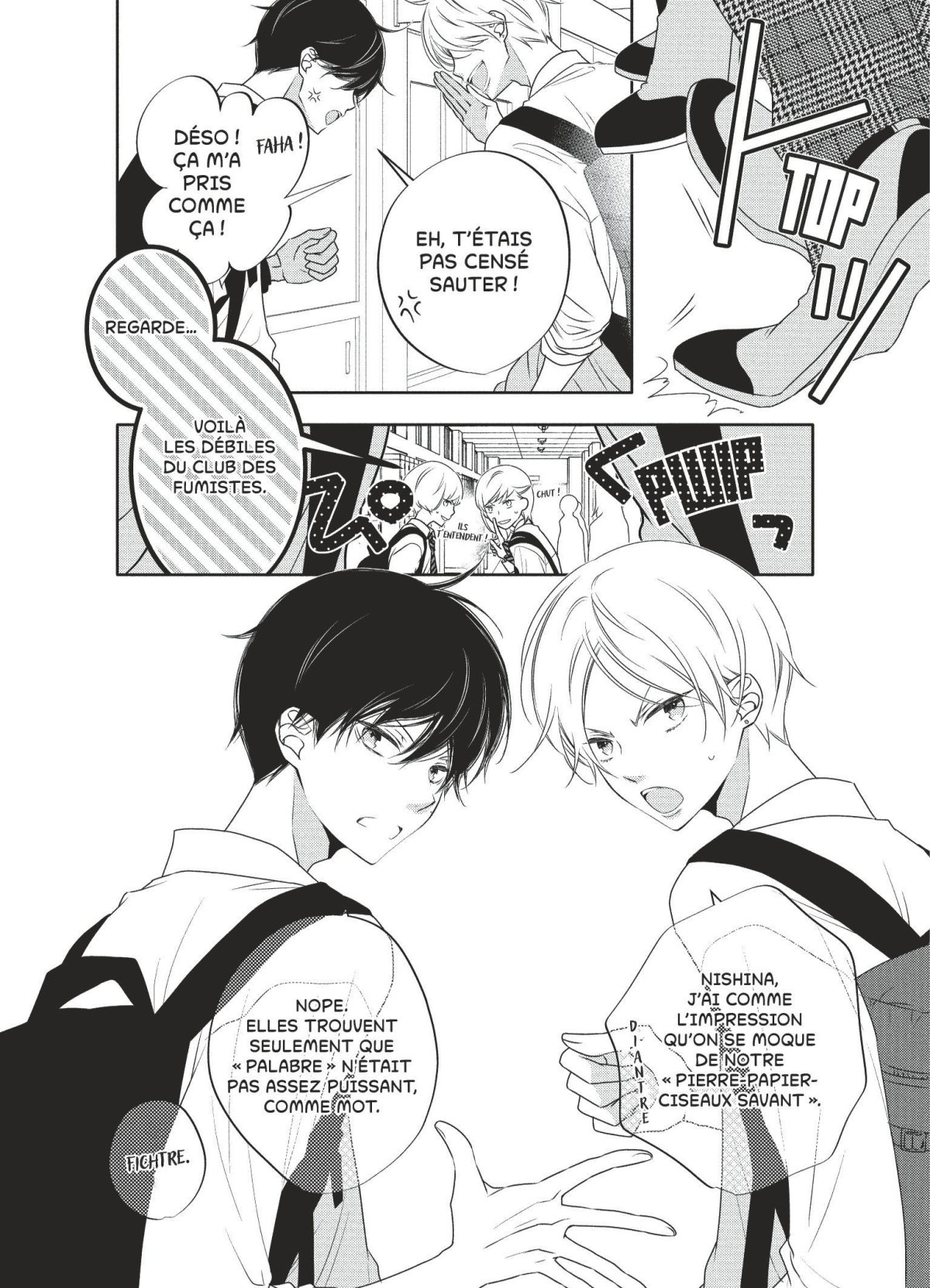Dans un ancien lycée de jeunes filles, quatre garçons mignons, mais un peu ringards, sont déterminés à tuer le temps de la manière la plus stupide possible. On les appelle le club des fumistes. Pourtant bien décidés à ne jamais tomber amoureux, l’amour va leur tomber dessus de la façon la plus rocambolesque qui soit. Dans ce volume, Nishina, l’un des membres du club, rencontre une jeune fille membre du club manga qui a perdu par mégarde une de ses planches.L’amour est-il au coin du couloir ?