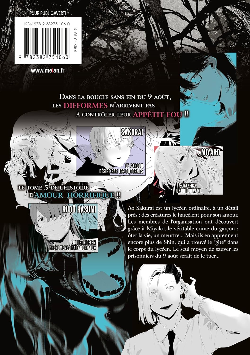 9 août, tu me dévoreras (Le) 5 est le volume 5 de la série 9 août, tu me dévoreras (Le) par Tomomi, paru en 2025. Selon nos informations, il n'en existe qu'une seule édition, publiée par Meian.