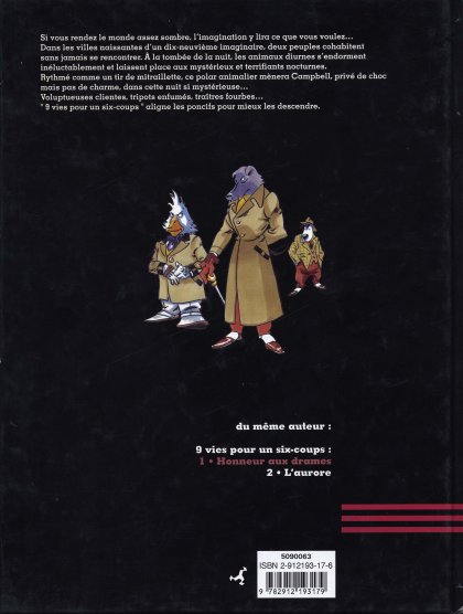 Si vous rendez le monde assez sombre, l’imagination y lira ce que vous voulez... Dans les villes naissantes d’un dix-neuvième imaginaire, deux peuples cohabitent sans jamais se rencontrer. À la tombée de la nuit, les animaux diurnes s’endorment inéluctablement et laissent place aux mystérieux et terrifiants nocturnes. Rythmé comme un tir de mitraillette, ce polar animalier mènera Campbell, privé de choc mais pas de charme, dans cette nuit si mystérieuse... Voluptueuses clientes, tripots enfumés, traîtres fourbes... " 9 vies pour un six-coups " aligne les poncifs pour mieux les descendre.