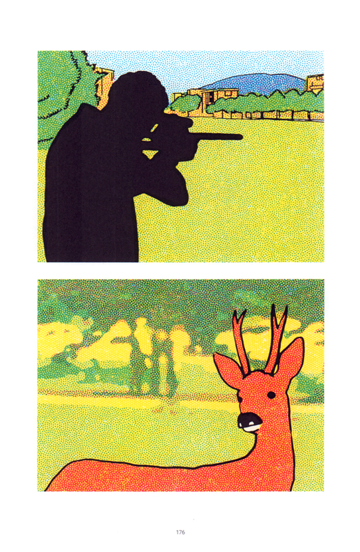 Le 24 août 2016, en Italie, un séisme causait la mort de 298 personnes et faisait près de 400 blessés. Giacomo Nanni piège l’instant dans un récit choral qui fait parler la montagne, s’attarde sur un chevreuil égaré devant un supermarché et traque la licorne dans le viseur de deux chasseurs. Son ode panthéiste confronte l’homme à la nature et la création au chaos, dans un magma graphique pointilliste et médusant