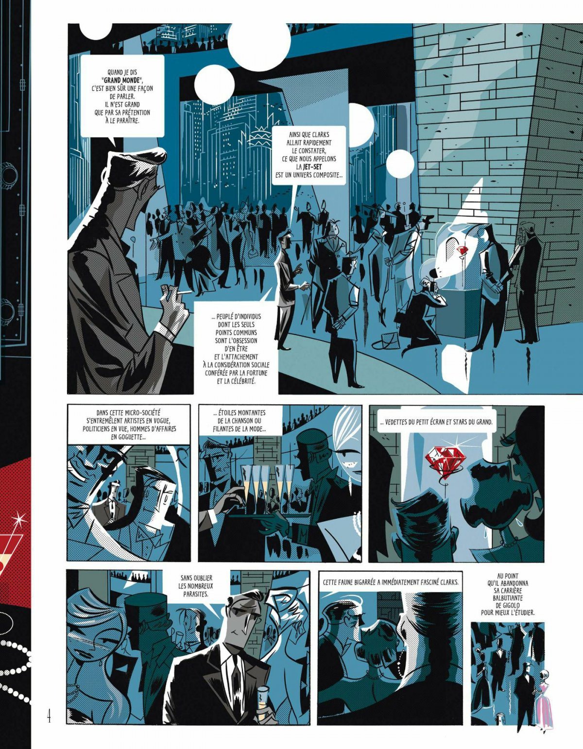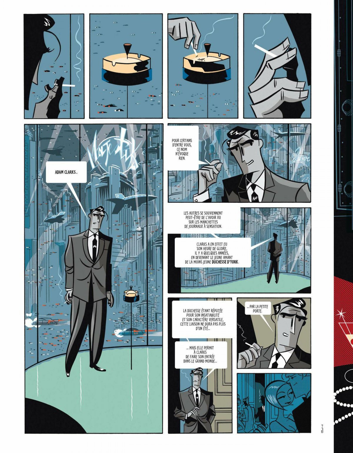 Dans un XXIe siècle fantasmé où la guerre froide sévit toujours et où la conquête de Mars est en marche, c’est lors d’une soirée mondaine où les « grands » de ce monde ont l’habitude de se retrouver que l’énigmatique Adam Clarks montre son vrai visage. On pourrait le croire trop occupé à faire des courbettes aux puissants et à séduire des beautés fatales. Mais il ne perd pas de vue son véritable objectif : un rubis de 100 carats d’une valeur inestimable, exposé à la vue de tous : le Long Star. La nuit, Adam fait montre de ses talents de monte-en-l’air pour subtiliser le bijou. Personne n’a rien vu, rien entendu. Personne ? Pas si sûr... Devenu à la fois la cible du KGB et de la CIA, Adam va devoir jouer sur les deux tableaux s’il veut s’en sortir.Avec Adam Clarks, Régis Hautière nous fait découvrir un héros classe et charismatique, entre Arsène Lupin et Mad Men, évoluant dans un univers proche des films d’espionnage d’antan. En digne représentant de l’école « atome », le trait stylisé et élégant d’Antonio Lapone restitue à merveille cette savoureuse ambiance uchronique, mêlant le futurisme à l’esthétisme des années 1960.
