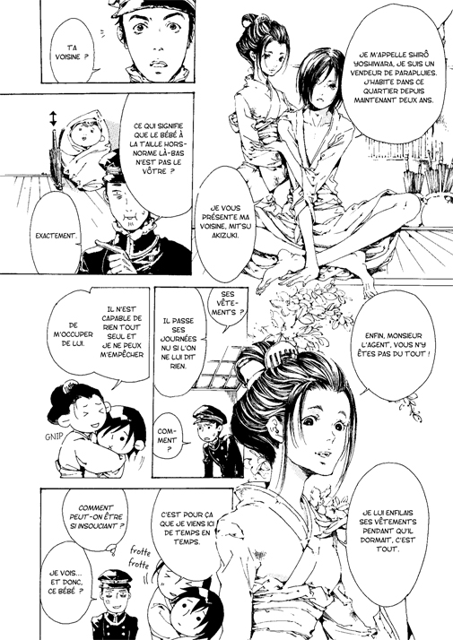 Shirô, un fabricant de parapluies lascif et sensuel, ancien maître d’arme de l’ombre, détestant par-dessus tout porter des sous-vêtements, rencontre Kôjirô, un lieutenant de police au sang chaud et amoureux de justice, dans un univers fantastique où l’extraordinaire surpasse bien souvent la raison. Ils se retrouvent tous les deux confrontés à une série d’incidents rocambolesques et paranormaux dans les bas-quartiers de leur ville... Tsukiji Nao nous gratifie d’une histoire palpitante souligné par un graphisme de toute beauté empli de finesse et de séduction. A dévorer sans modération !