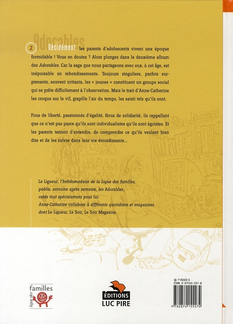 Décidément, les parents d’adolescents vivent une époque formidable ! Vous en doutez ? Alors plongez dans le deuxième album des Adorables. Car la saga que nous partageons avec eux, à cet âge, est inépuisable en rebondissements. Toujours singuliers, parfois surprenants, souvent irritants, les " jeunes " constituent un groupe social qui se prête difficilement à l’observation. Mais le trait d’Anne-Catherine les croque sur le vif, grappille l’air du temps, les saisit tels qu’ils sont. Fous de liberté, passionnés d’égalité, férus de solidarité, ils rappellent que ce n’est pas parce qu’ils sont individualistes qu’ils sont égoïstes. Et les parents tentent d’entendre, de comprendre ce qu’ils veulent bien dire et de les suivre dans leur vie étourdissante.