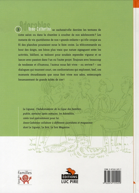 Anne-Catherine se cacherait-elle derrière les tentures de notre salon ou dans la chambre à coucher de nos adolescents ? Les instants de vie quotidienne de nos " grands enfants " qu’elle croque au fil des planches pourraient nous le faire croire. La télécommande au bout des doigts, ses héros plus vrais que nature zigzaguent entre les activités, bâillent, se trament pour soudain reprendre vigueur et se lancer avec passion dans l’un ou l’autre projet. Toujours avec beaucoup de tendresse et d’humour, l’auteur nous fait vivre - ou revivre ? - ces dialogues qui tournent court, ces confrontations qui explosent, bref, ces moments étourdissants que nous font vivre nos ados, entrecoupés heureusement de grands éclats de rire !