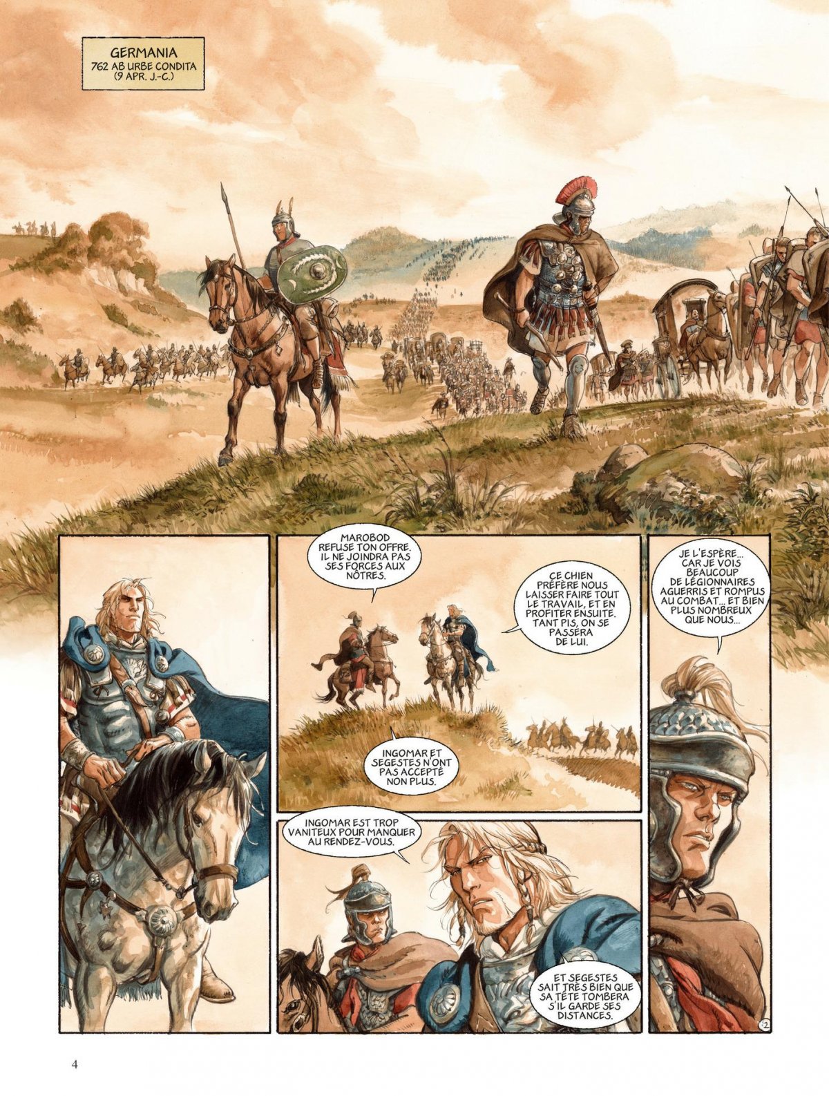 Prêt à attaquer, le loup se tient parmi les Aigles de Rome. Qui d’entre eux se douterait qu’Arminius, en qui le général romain a toute confiance, est désormais devenu le chef de guerre des Germains ? Sa trahison a porté ses fruits : l’armée romaine est attaquée de tous côtés et Marcus, prisonnier, n’a jamais été aussi impuissant. Derrière ses barreaux, il ne peut ni combattre son ancien frère de sang ni protéger Priscilla et son fils... Enrico Marini signe ici des scènes de combat d’anthologie !