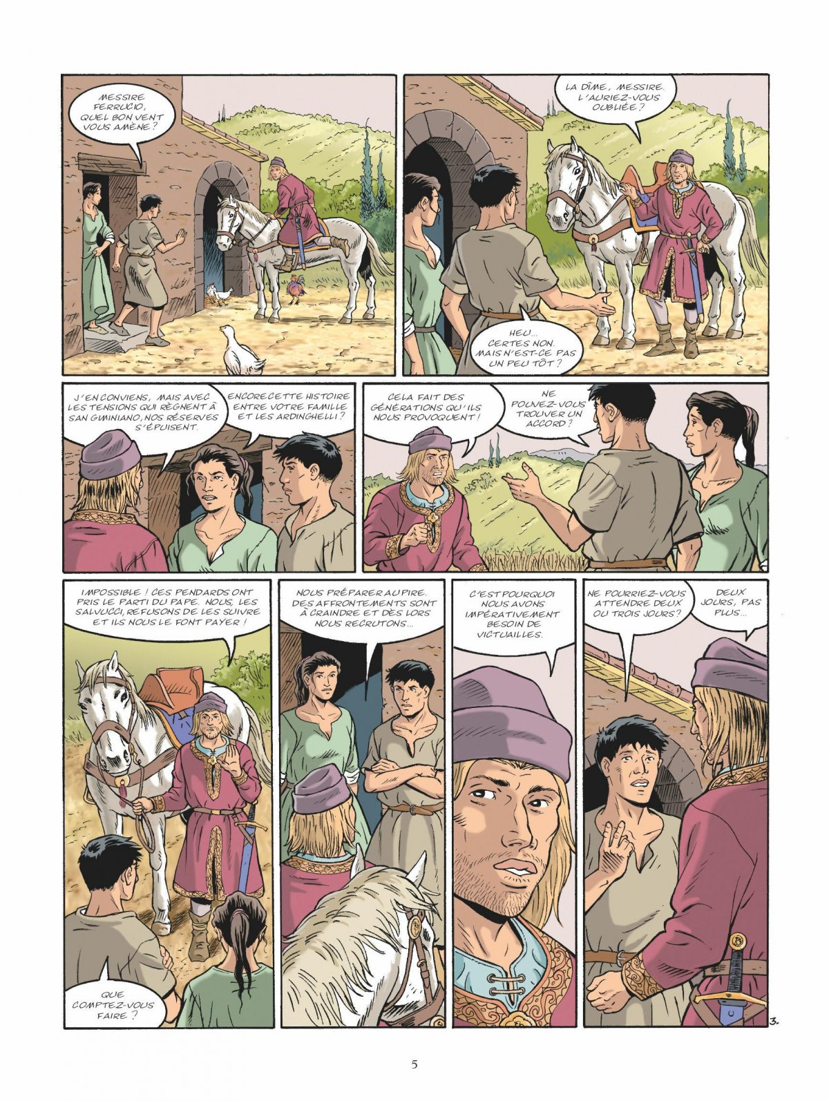 Mai 1274. Voilà deux ans que Sigwald et Gisella mènent une vie de fermier dans la paisible campagne près de la cité de San Giminiano. Pour autant le jeune chevalier n’arrive pas à se faire à cette nouvelle existence, sentant retentir en lui l’appel des armes et de l’aventure... Viendra-t-il du château de Crozenc, où sa soeur Mahaut entretien une relation tumultueuse avec un jeune charbonnier du nom de Jocelin ? Ou des dissensions entre guelfes et gibelins, deux factions rivales, qui embrasent la région de San Giminiano ?