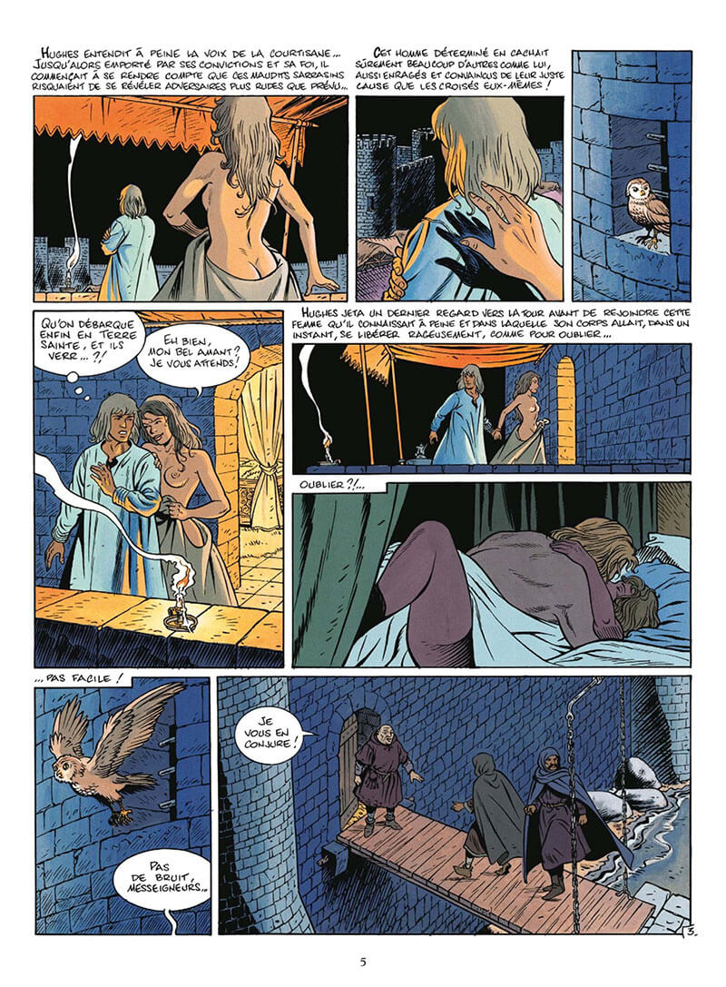 Hughes de Crozenc est toujours sur la route de Jérusalem. Après avoir tué Aliénor de Luzignan et tenté d’assassiner le roi Louis IX, le Sarrasin Al Mansour est en prison, torturé avant d’être exécuté. Mais grâce à des complices, celui-ci parvient à s’évader. Hughes se jure de le retrouver.Robert d’Artois, l’un des frères du roi, pense que le conflit qui les oppose aux Sarrasins ne peut se régler que par les armes, et devient du même coup le grand rival d’Hughes de Crozenc. Il souhaite l’éliminer, et compte bien se donner les moyens de parvenir à ses fins...