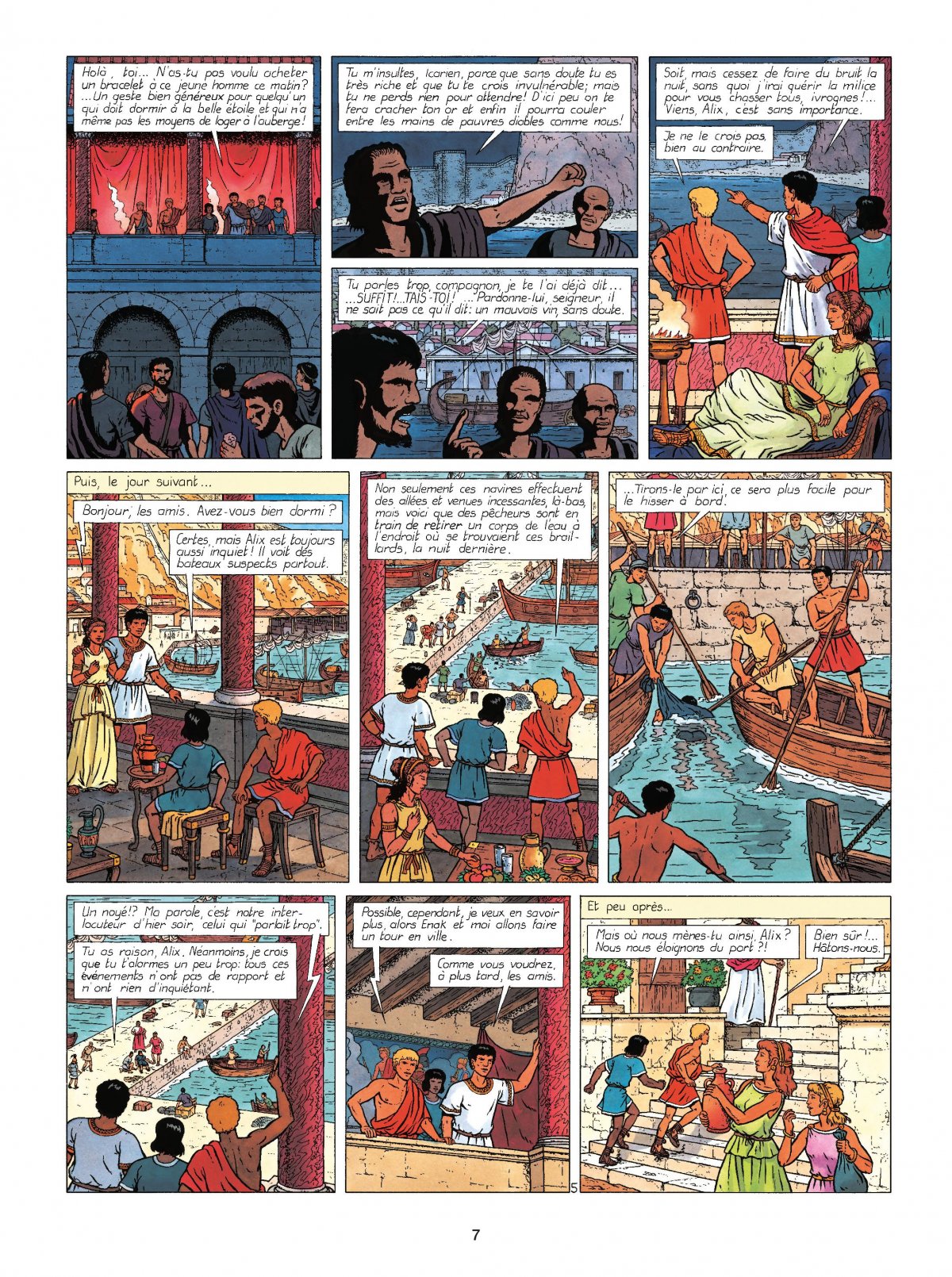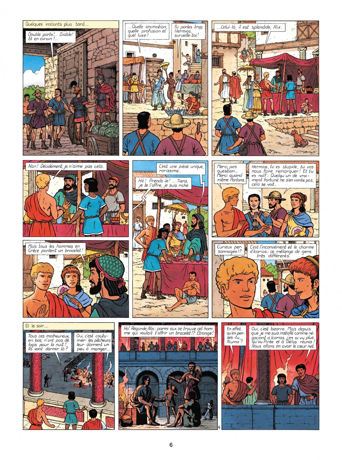 Au sein de la mer Égée, l’île d’Icarios a une extraordinaire réputation grâce à son sanctuaire dédié au dieu guérisseur Asclepios. La riche cité, entourée de puissants remparts établis jadis par les grecs, est dominée, près de sa rade, par un immense rocher d’où, prétendent les Icariens, le célèbre héros Icare se serait envolé vers le Péloponèse. Un soir, tandis qu’Alix et Enak débarquent dans le port, d’étranges bateaux accostent sur une partie déserte de l’île. Heureusement prévenue à temps par Alix, la petite garnison de soldats romains s’enferme derrière les murs de la place forte. Ce sont des pirates qui encerclent le sanctuaire, avec à leur tête, le redoutable Arbacès que tous croyaient mort