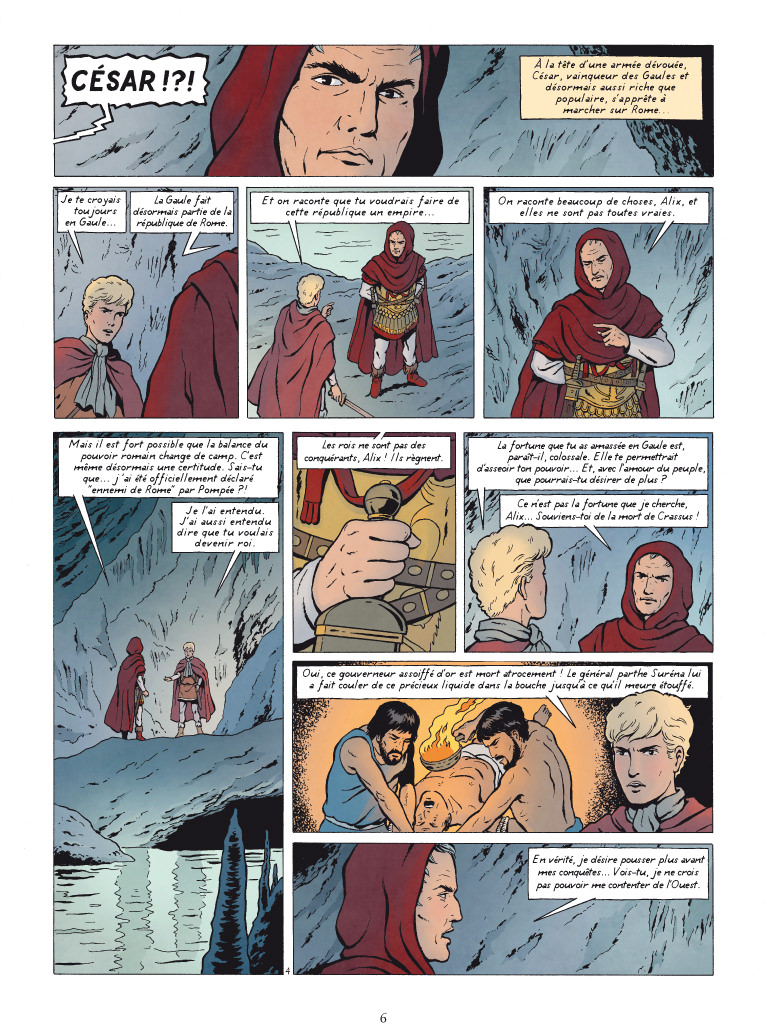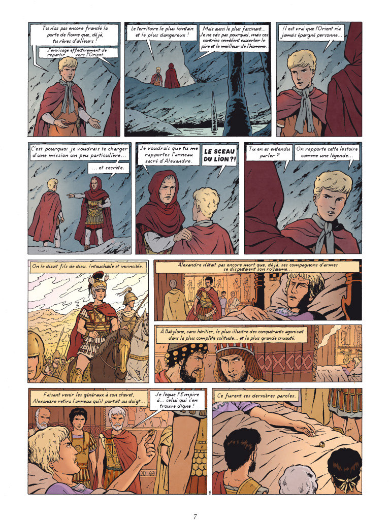 À Rome, la guerre civile est sur le point d’éclater entre Pompée, le général qui administre Rome depuis des années et son rival César, qui vient tout juste de rentrer de Gaule en conquérant victorieux, auréolé de gloire. La balance du pouvoir s’apprête à changer de camp... Mais l’ambitieux César, à qui l’on prête le projet de transformer la république en Empire, ne veut pas se contenter de ses conquêtes occidentales. Fasciné par l’Orient, il confie une mission secrète à Alix : trouver et rapporter l’anneau réputé magique du plus grand conquérant que l’Histoire ait connu, Alexandre. César y voit à la fois une protection divine et l’instrument de ses desseins : quiconque sera porteur de l’anneau pourra légitimement revendiquer l’union politique de l’Orient et de l’Occident. Pour retrouver l’anneau, Alix ne dispose que d’une piste : de mystérieuses pièces d’or frappées à l’effigie d’Alexandre. Sous la conduite d’un prisonnier, Asham, Alix, Enak et l’homme de confiance de César, le gaulois Luctérius, s’efforcent d’en retracer la provenance, direction le Levant. Affrontant mille dangers, ils ne savent pas encore qu’ils parviendront jusqu’à l’étrange et sauvage Bactriane - l’actuel Afghanistan -, ultime conquête d’Alexandre le Grand.