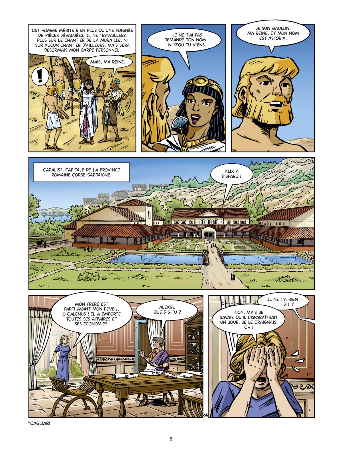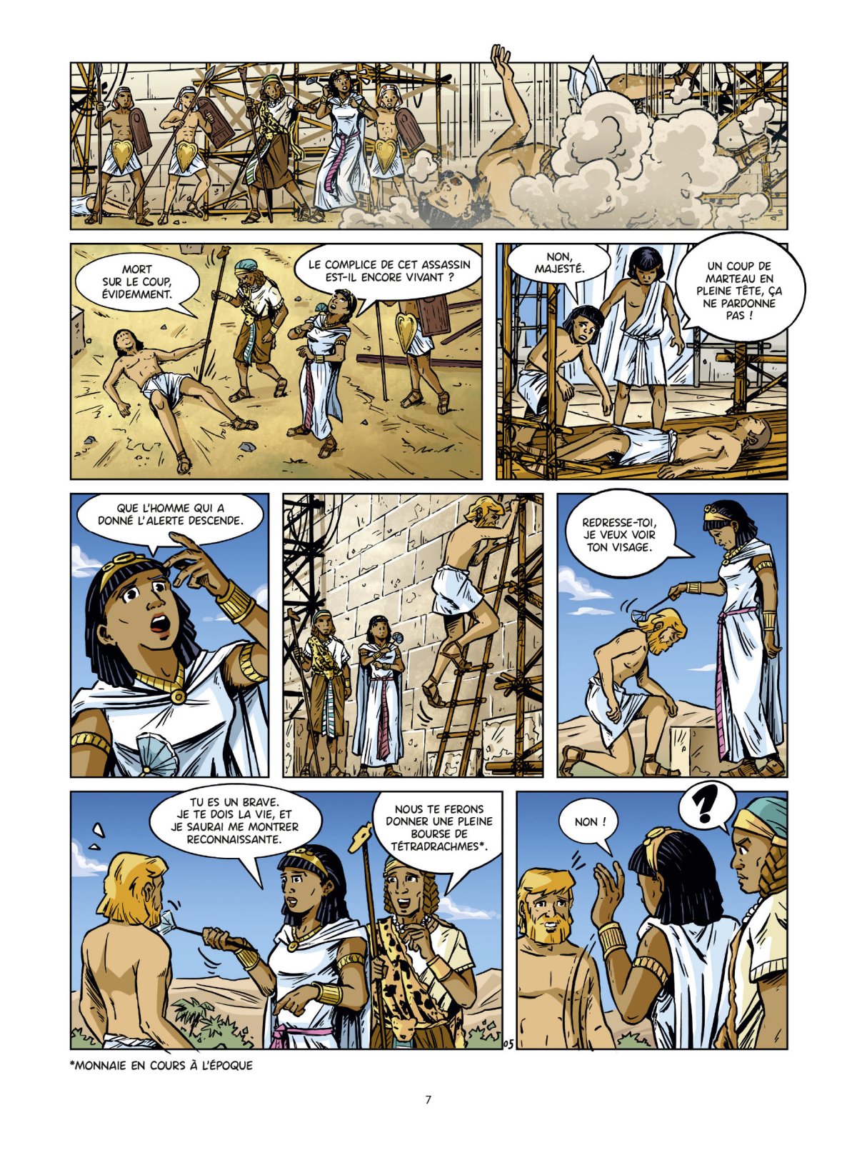 Depuis la Sardaigne où il a été pris en charge par le gouverneur Calénus Alix n’a qu’une idée en tête : retrouver la trace de son père. Ce dernier est devenu esclave en Egypte. Alors que des ouvriers d’un chantier tentent d’attenter à la vie de la reine Bérénice en visite sur celui-ci Astorix la sauve. De son côté Alix s’embarque vers le pays des Pharaons pour retrouver son père. Débarqué à Alexandrie il fait la rencontre de Tahoser la fille du Grand Prêtre. C’est dans cette ville qu’il découvre une conspiration contre la souveraine