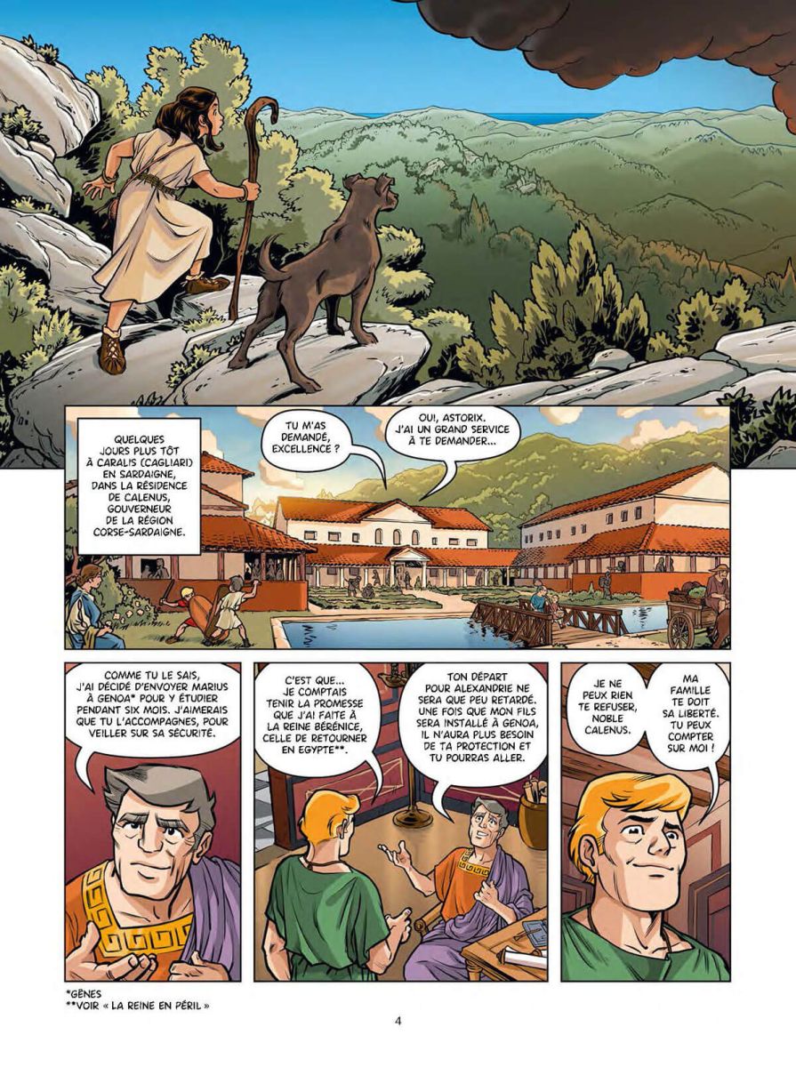 Marius, un jeune garçon de 10 ans, est envoyé par son père, le gouverneur Calenus, à Gênes pour étudier. Il voyage sous la protection d’Astorix et de son fils Alix. En chemin, leur navire est pris dans un ouragan et l’équipage est contraint de se réfugier sur la côte corse, ravagée par un incendie. Sur la plage, ils rencontrent Catalina, une jeune bergère séparée de son village à cause du feu. Elle refuse d’abandonner sa terre, Alix décide de l’aider à retrouver sa famille. Marius, malgré les dangers, insiste pour les accompagner, obligeant Astorix et ses hommes à les suivre. Leur périple les confronte à un paysage dévasté, une nature hostile et des obstacles de plus en plus périlleux. Pendant ce temps, le préteur de Corse, Sulburnus, apprend la présence de Marius et envoie un détachement de soldats avec l’intention de capturer le garçon pour faire pression sur son père.