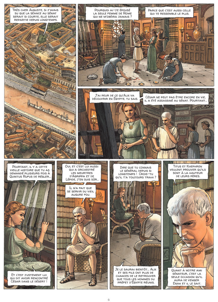 Alexandrie, an 12 avant Jésus-Christ. Accompagné de ses fils Titus et Khephren, Alix Gracchus, désormais sénateur romain, parvient à Alexandrie, où il est en mission pour le compte de son ami et protecteur, le puissant empereur Auguste. Suite aux événements tragiques survenus dans La Trahison des rapaces, Alix doit retrouver la trace du général Quintus Rufus, qu’Auguste soupçonne d’être responsable des meurtres d’Agrippa et de Lépide. Revenir ainsi en Egypte est peut-être aussi une occasion unique, pour Alix, de venger enfin la mort du père de Khephren, Enak, son ancien compagnon d’aventures. Sur place, Alix est attendu par une vieille connaissance, le préfet Barbarus. Mais aussi, dans l’ombre, par d’autres personnages, qui ne lui veulent manifestement pas du bien..