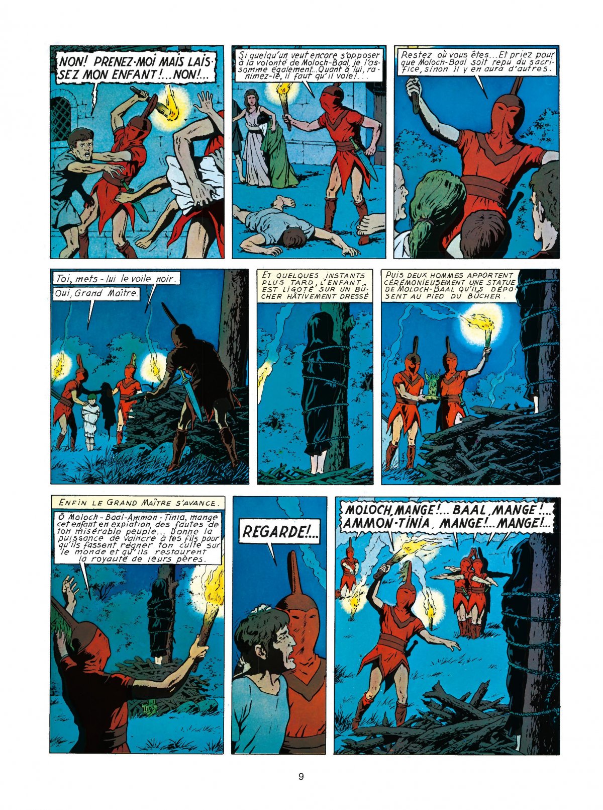 Dormant à la belle étoile, Alix, Enak et le jeune Octave, neveu de Jules César, sont soudain alertés par des cavaliers masqués qui attaquent une grosse exploitation campagnarde. Ligoté à un poteau pour être livré aux flammes du dieu Baal-Moloch, un enfant est sauvé par leur intervention. C’est Brutus qui conspire avec le préfet de Tarquini. Ils ont recréé une société secrète d’adeptes de Baal, dieu sanglant qui demande feu et sang. Alix et ses compagnons, en route vers Rome pour conter à César leurs suspicions, sont suivis et pris en chasse par les cavaliers rouges.