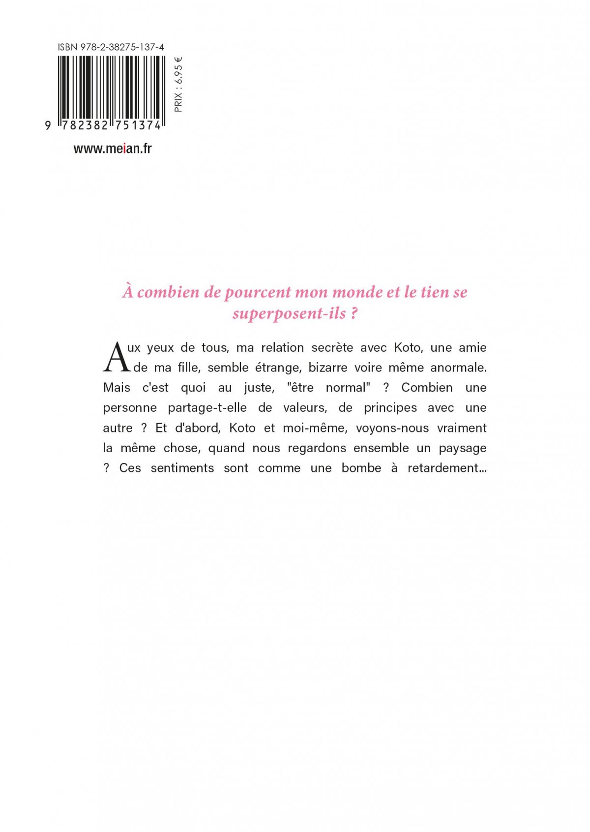 Aux yeux de tous, ma relation secrète avec Koto, une amie de ma fille, semble étrange, bizarre voire même anormale. Mais c’est quoi au juste, "être normal" ? Combien une personne partage-t-elle de valeurs, de principes avec une autre ? Et d’abord, Koto et moi-même, voyons-nous vraiment la même chose, quand nous regardons ensemble un paysage