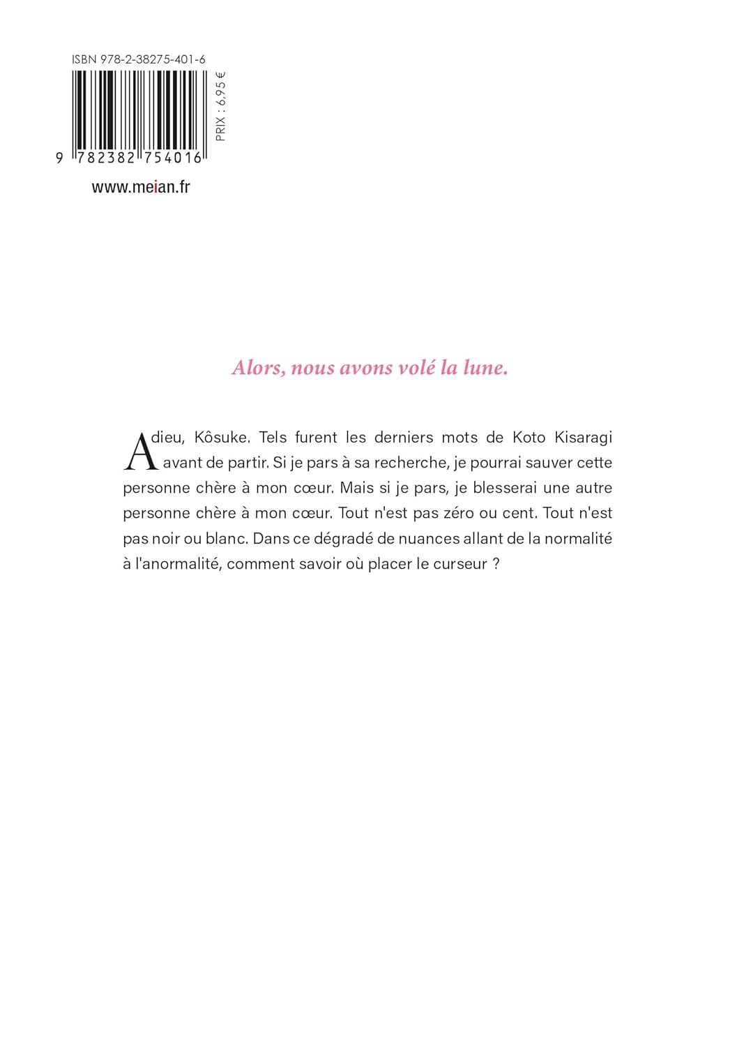 Adieu, Kôsuke. Tels furent les derniers mots de Koto Kisaragi avant de partir. Si je pars à sa recherche, je pourrai sauver cette personne chère à mon coeur. Mais si je pars, je blesserai une autre personne chère à mon coeur. Tout n’est pas zéro ou cent. Tout n’est pas noir ou blanc. Dans ce dégradé de nuances allant de la normalité à l’anormalité, comment savoir où placer le curseur ?