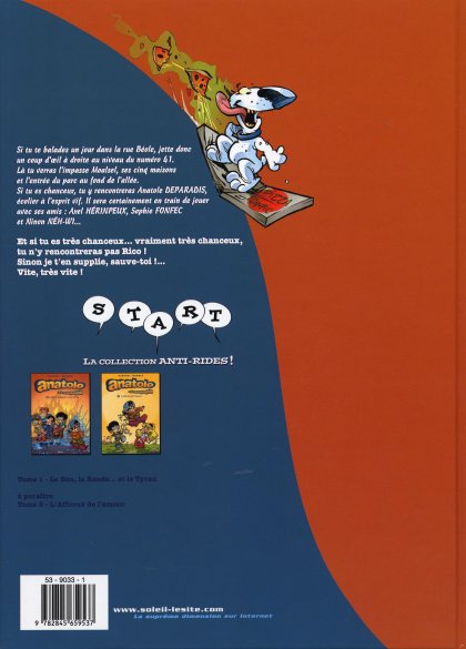 Si vous vous promenez un jour dans la rue Béole, au niveau du numéro 41, se trouve L’impasse Moalsel. Avec un peu de chance, vous y verrez Anatole Deparadis en train de jouer avec ses amis Axel, Hérinpeux, Sophie Fonfec et Ninon Nèh-Wi. Et si vous avez vraiment beaucoup de chance, vous n’y croiserez pas Rico, la nouvelle terreur du quartier ! Sinon fuyez... vite, très vite !