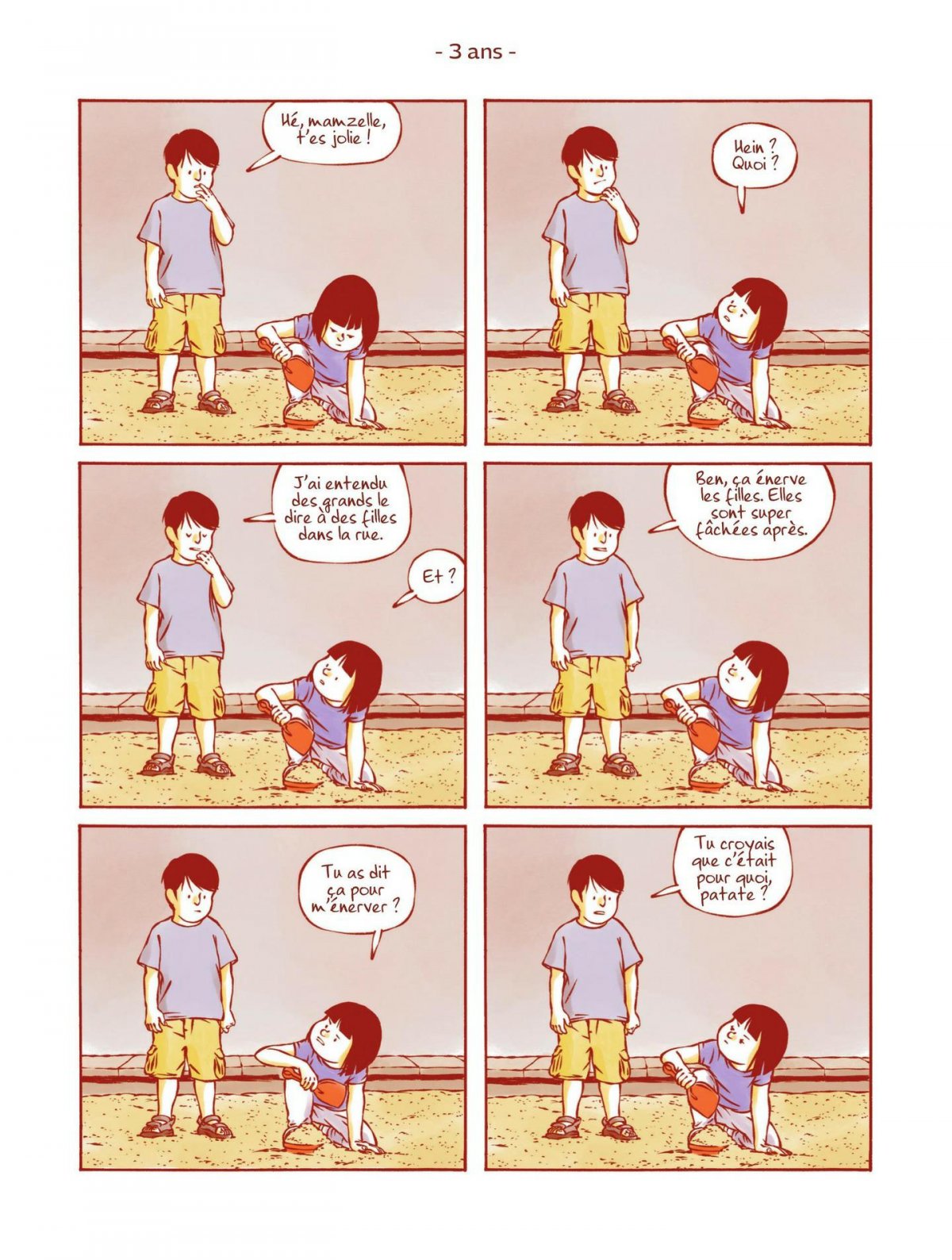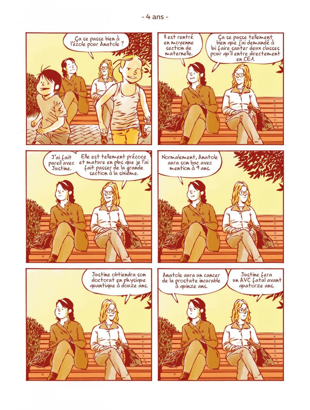 Découvrez la vie d’Anatole, de sa naissance à sa mort, comme des instantanés de vie à chaque âge. Anatole est un garçon puis un homme assez lambda. Il va découvrir les différents stades de la vie (enfance, adolescence, émancipation, vie de couple, vie de bureau, paternité) pour finalement tenter de trouver sa place d’homme « moderne » dans une société en pleine mutation. À travers cet album, James décortique les étapes qui constituent la vie d’un homme en puisant dans ses souvenirs et son vécu personnel avec tendresse et humour.