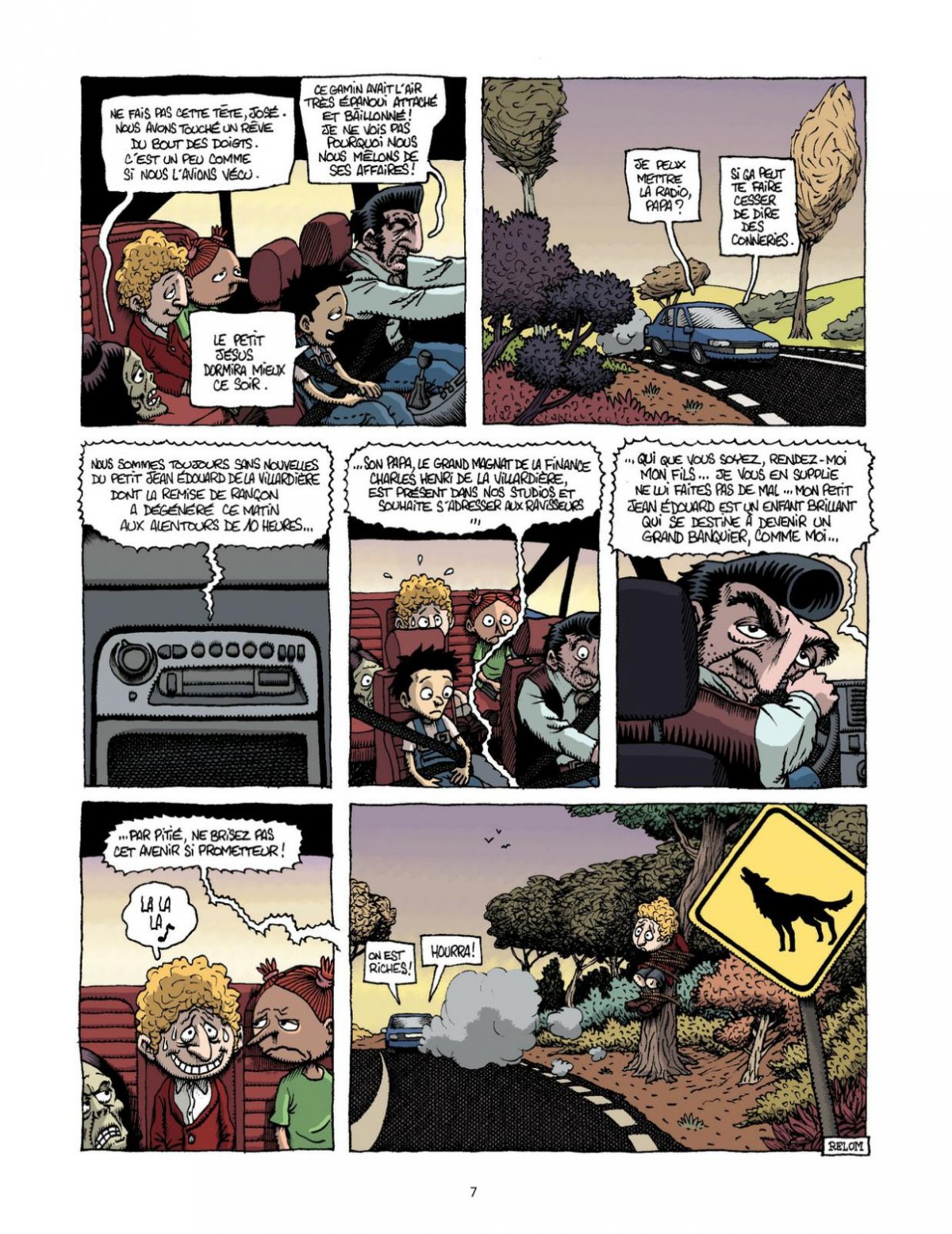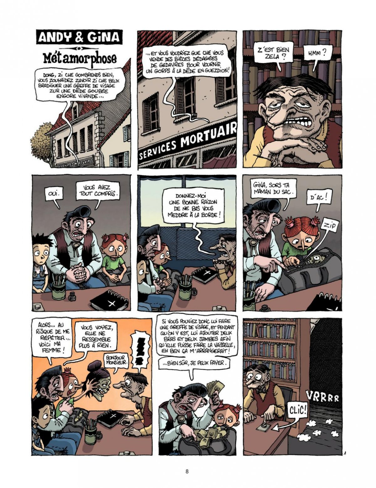 Retrouvons, chers auditeurs, Andy, Gina, leur papa et leur maman (qui n’est plus qu’une tête décharnée) qu’on avait laissés faisant de l’auto-stop en rase campagne à la fin du dernier album. Dans ce 5e tome, ils trouveront une fortune qu’ils s’empresseront de dépenser auprès d’un croquemort véreux façon docteur Frankenstein afin qu’il redonne forme humaine à leur maman. L’opération ne sera qu’à moitié réussie mais ils y gagneront une petite maison isolée dans les bois. C’est dans ce décor idyllique (et dans lequel leur papa n’aura de cesse que de les perdre, faisant passer les parents du Petit Poucet pour des saints) qu’ils apprendront à manier les armes à feu, qu’ils croiseront le chemin de créatures toutes plus fantastiques les unes que les autres : une licorne ailée, des ratons-laveur tireurs d’élite, des quéquettes volantes, une sorcière adepte des méthodes bio ou des dealers de crack incompétents.