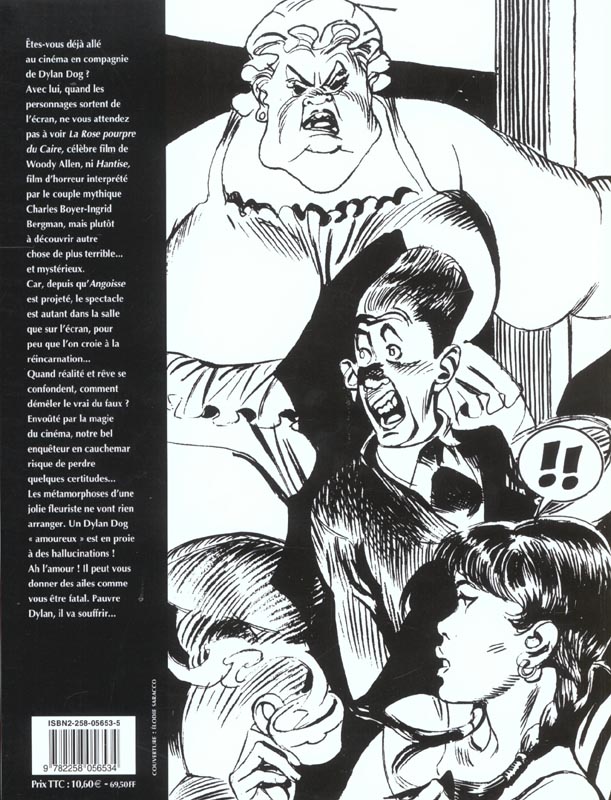 Êtes-vous déjà allé au cinéma en compagnie de Dylan Dog ? Avec lui, quand les personnages sortent de l’écran, ne vous attendez pas à voir La Rose pourpre du Caire, célèbre film de Woody Allen, ni Hantise, film d’horreur interprété par le couple mythique Charles Boyer-Ingrid Bergman, mais plutôt à découvrir autre chose de plus terrible... et mystérieux. Car, depuis qu’Angoisse est projeté, le spectacle est autant dans la salle que sur l’écran, pour peu que l’on croie à la réincarnation