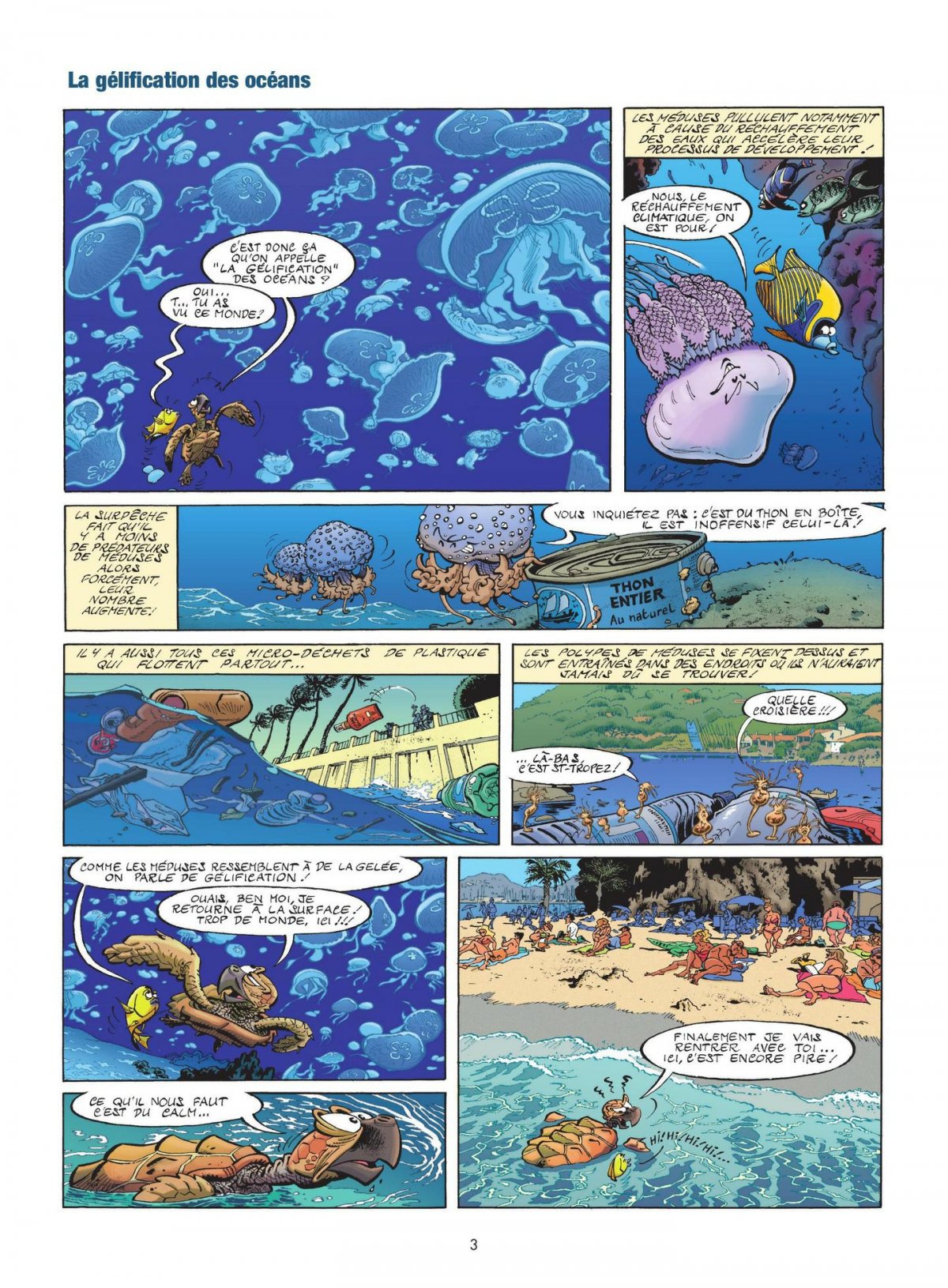 Si vous vivez au-dessous du niveau de la mer, vous savez certainement les problèmes que posent la surpêche ou la pollution des eaux par les plastiques, vous connaissez aussi certainement les dauphins et les méduses. Vous savez aussi que les méduses sont en surpopulation, n’est-ce pas ? Et vous connaissez à coup sûr les chitons, ces mollusques brouteurs ? Mais si vous n’avez pas la chance de vivre sous l’eau, alors un masque et un tuba vous seront utiles pour découvrir ce monde fascinant en compagnie des Animaux marins en BD !