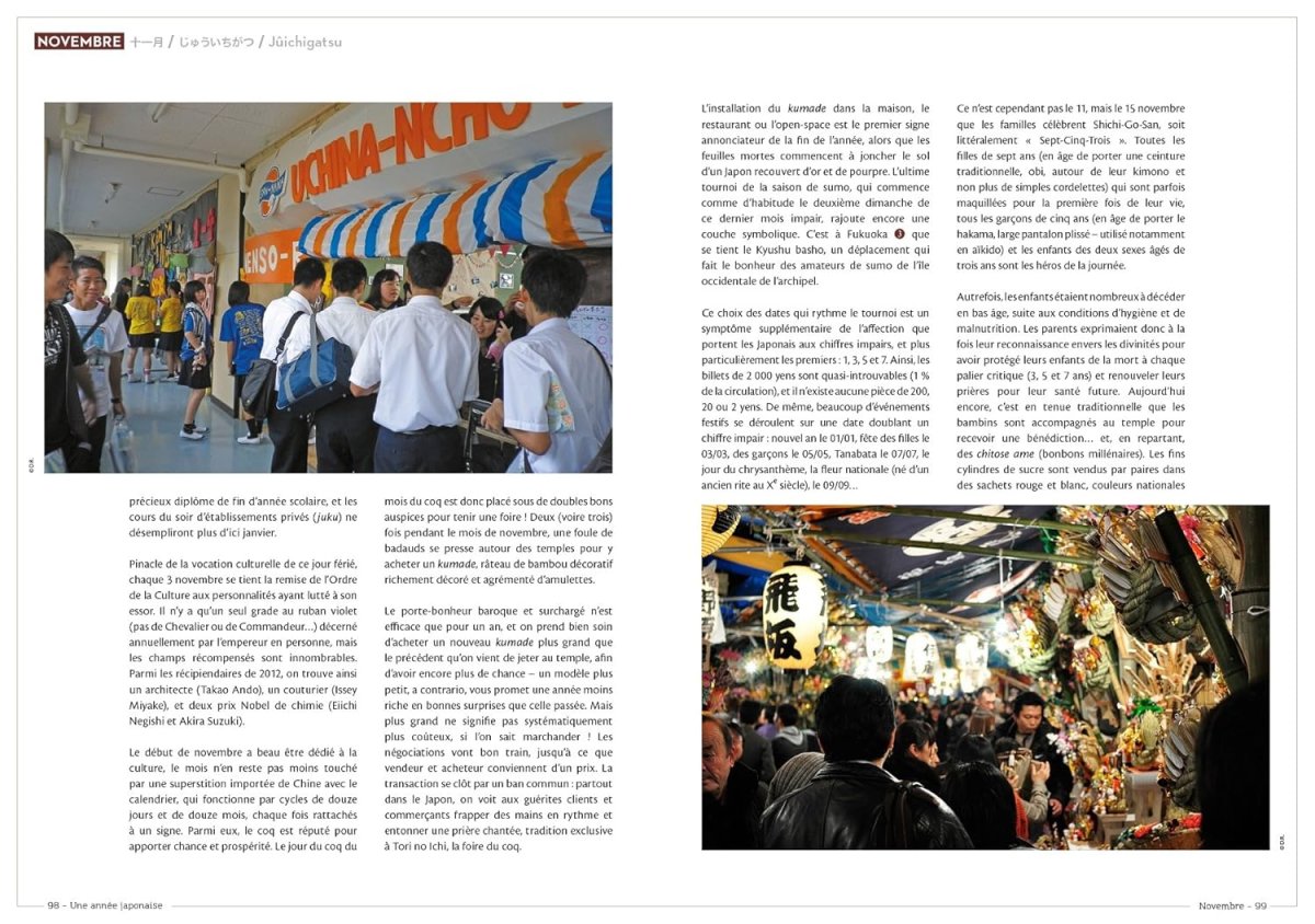 Les lecteurs curieux y trouveront les clés pour saisir les habitudes nippones et décrypter les codes d’un pays encore énigmatique, et les futurs touristes y dénicheront les conseils d’un compagnon idéal pour optimiser leur séjour au Japon en fonction du mois de leur voyage. Quand la rentrée des classes a-t-elle lieu ? Quand a lieu la fête nationale ? Comment se déroulent des "classiques occidentaux" comme Noël ou la Saint-Valentin au pays du Soleil-Levant ? Quels sont les plats de saison, les tournois sportifs annuels incontournables ? Quels sont les festivals culturels à ne pas manquer ? Autant de questions qui trouveront leurs réponses dans Une année japonaise, un livre permettant de s’immerger complètement dans les événements qui ponctuent la vie des Japonais.