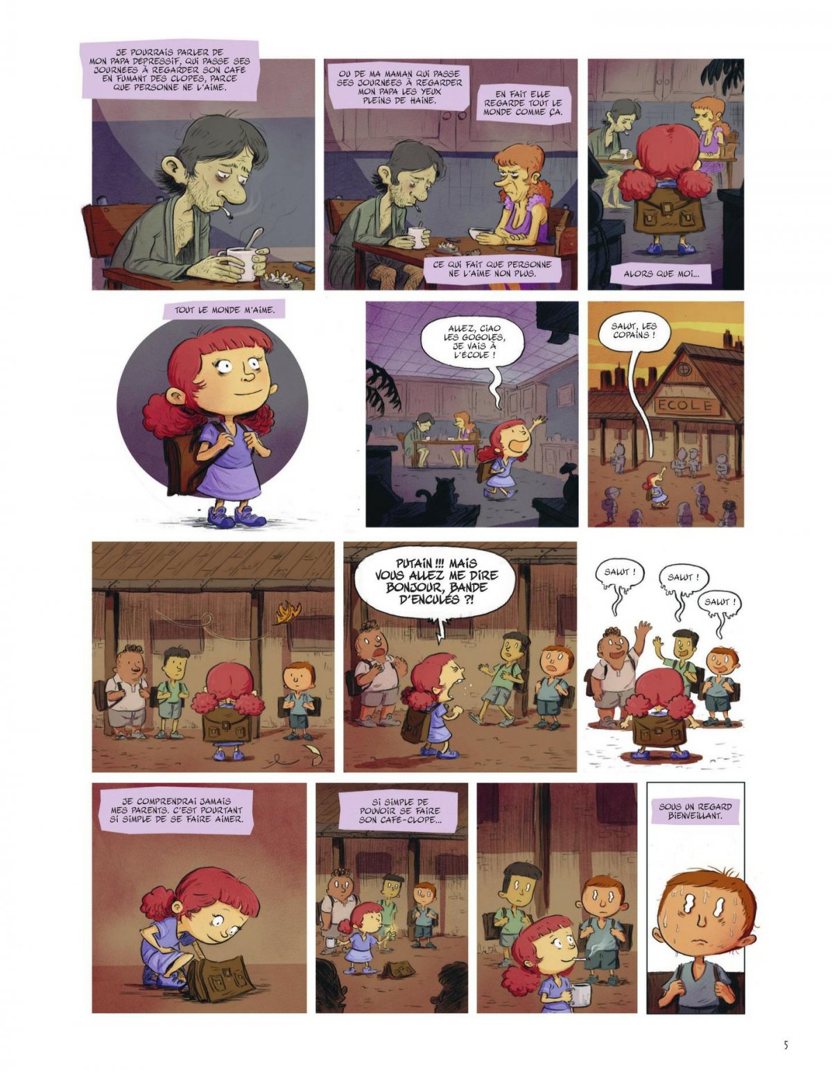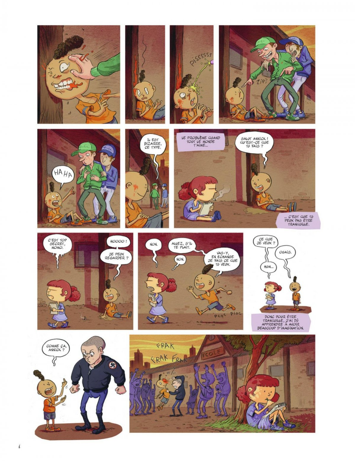 Le temps d’un album, Annick vous présentera son monde : ses parents dépressifs au bord de la rupture, Stéphane, la tête d’ampoule insupportable mais qu’elle aime secrètement, Momo, le benêt gentil qui sourit tout le temps et tout un paquet d’autres camarades de classe qui l’insupportent et l’énervent en permanence.
