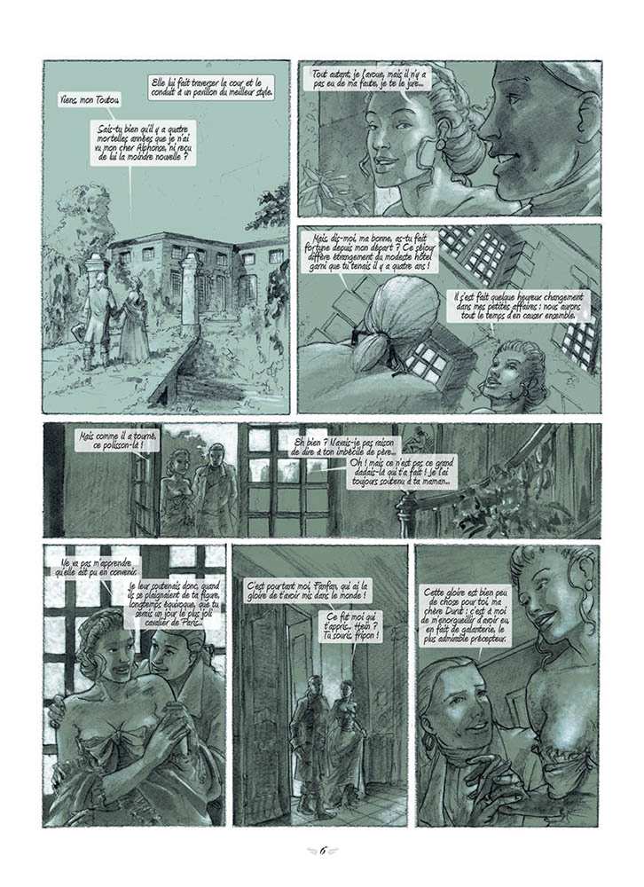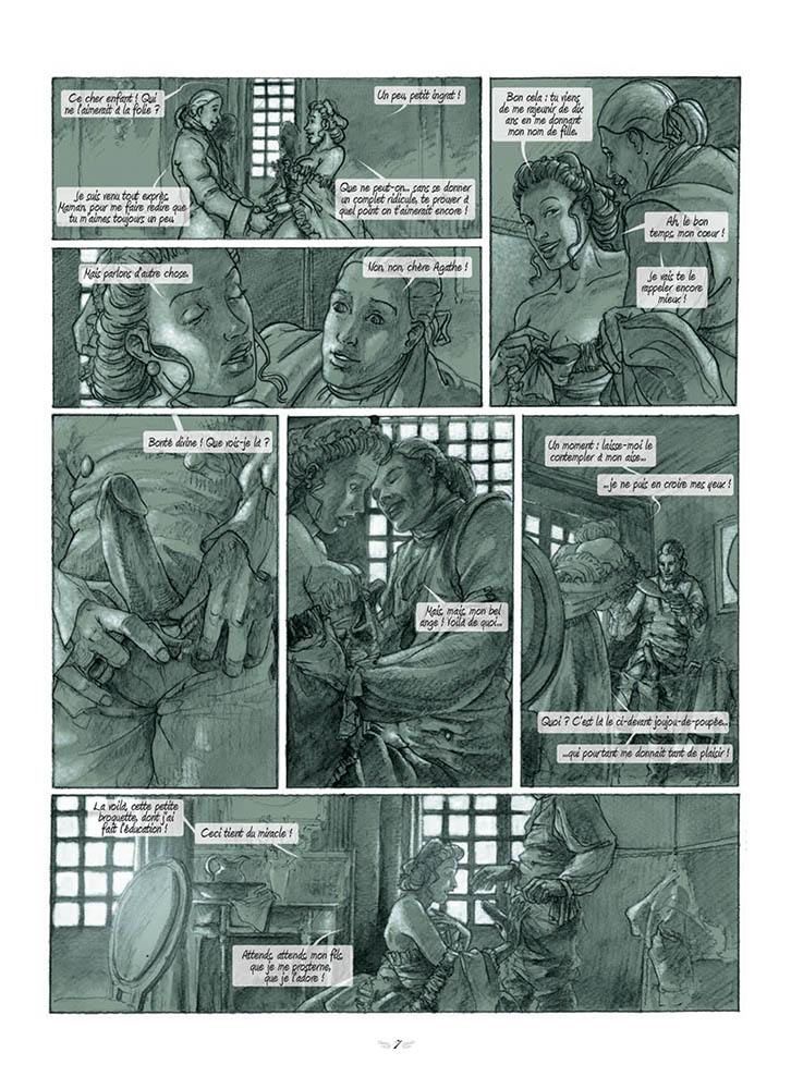 Ecrit en 1793, Les Aphrodites est, à l’origine, un de ces romans « qu’on ne lit que d’une main » dont l’univers est une joyeuse débauche. En un siècle où les sociétés secrètes abondent, il fut un groupe de libertins, près de Paris, qu’on nommait "Les Aphrodites". L’auteur y place l’intrigue de son marivaudage et décrit ses contemporains en véritable humaniste : les hommes sont juge ?s sur leurcalibre et leurs performances, les femmes sur leurs qualités et leur expérience. Libertin donc, mais surtout hédoniste car Nerciat est aux antipodes de la morgue du marquis de Sade. Le Chevalier vient retrouver Mme Durut, sa marraine en matière de plaisir, à l’hôtel de rencontre pour nobles dont elle est l’intendante. Les retrouvailles, après quatre années, sont fougueuses. Comme la Duchesse se morfond dans l’attente du comte, en retard au rendez-vous donné, Mme Durut lui propose, après les services d’un jeune "jockey", de rencontrer le Chevalier qu’elle fait passer pour son neveu. Le retardataire sera de son côté retenu comme il se doit, à son arrivée, par l’adorable Célestine, une fringuante espiègle, à laquelle il ne saura résister. La Duchesse reprend ses esprits etoubliant soudain le plaisir obtenu avec celui qu’elle tient encore pour un roturier, crie au viol et menace de suicide. Mme Durut venue défendre son champion, est suivie par le Comte jaloux qui aussitôt exige des réparations. Elle doit alors leur révéler la condition d’un Chevalier déjà prêt à en découdre. Célestine vient enfin s’ajouter au tableau pour apaiser les passions, en rappelant au Comte ses propres incartades. Les cinq personnages se retrouvent autour d’un dîner de réconciliation qui tourne vite à la bacchanale. On l’aura compris, Les Aphrodites est une sorte de vaudeville, une histoire de placards où la langue fine du 18e siècle est mise en valeur par le dessin de grande qualité d’Emmanuel Murzeau.