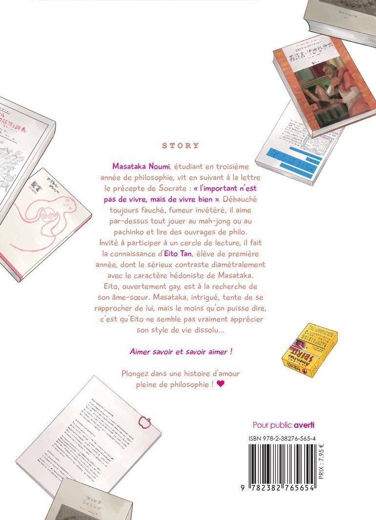 Masataka Noumi, étudiant en troisième année de philosophie, vit en suivant à la lettre le précepte de Socrate : " l’important n’est pas de vivre, mais de vivre bien ". Débauché toujours fauché, fumeur invétéré, il aime par-dessus tout jouer au mah-jong ou au pachinko et lire des ouvrages de philo.Invité à participer à un cercle de lecture, il fait la connaissance d’Eito Tan, élève de première année, dont le sérieux contraste diamétralementavec le caractère hédoniste de Masataka. Eito, ouvertement gay, est à la recherche de son âme-soeur. Masataka, intrigué, tente de se rapprocher de lui, mais le moins qu’on puisse dire, c’est qu’Eito ne semble pas vraiment apprécier son style de vie dissolu...Aimer savoir et savoir aimer !Plongez dans une histoire d’amour pleine de philosophie !
