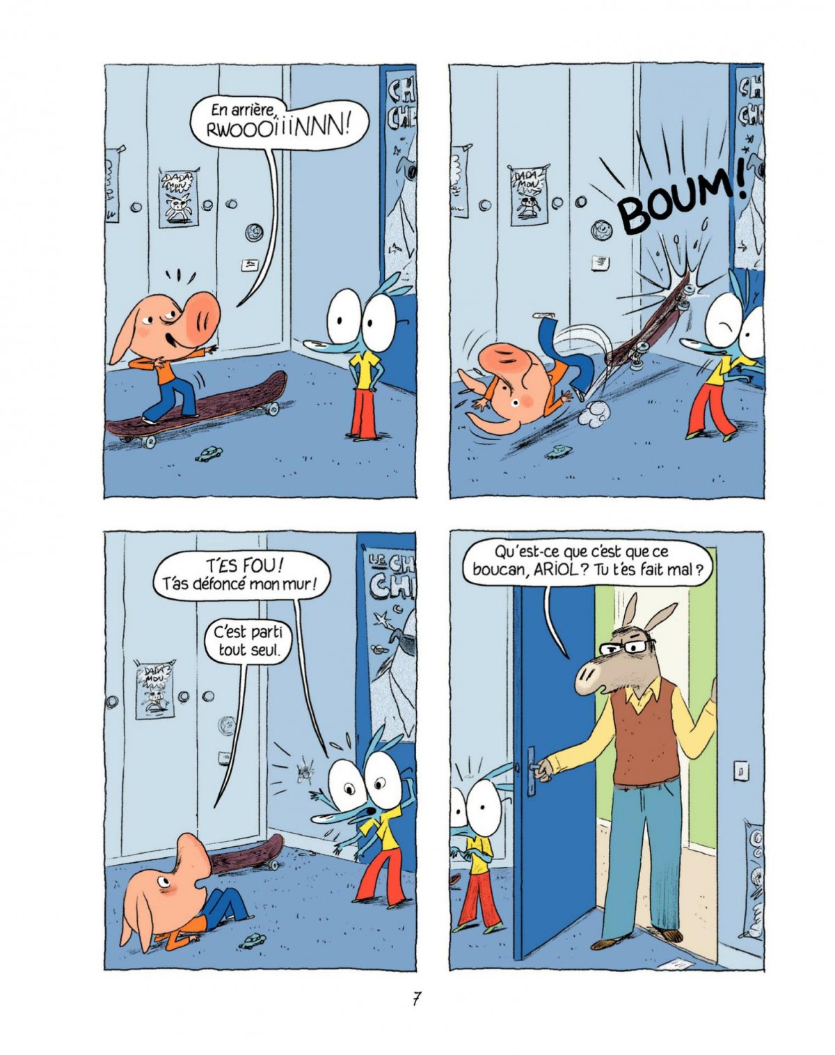 Ce volume met en avant la figure de monsieur Blount, maitre d’école à la fois attentif et exigeant. Rarement rasé mais jamais rasoir, il se montre fin pédagogue en apprenant notamment aux élèves à dessiner un visage avec des chiffres ! L’univers d’Ariol évoque à nouveau maison, loisirs et quotidien : achat compliqué d’un nouvel anorak (les capuches, c’est nul !), pièce de théâtre de fin d’année, asperges au dîner, feu d’artifices.