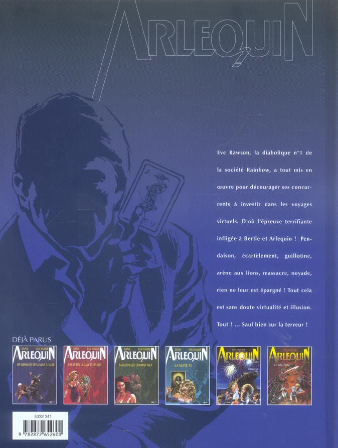 Eve Rawson, la diabolique n°1 de la société Rainbow, a tout mis en oeuvre pour décourager ses concurrents à investir dans les voyages virtuels. D’où l’épreuve terrifiante infligée à Bertie et Arlequin ! Pendaison, écartèlement, guillotine, arène aux lions, massacre, noyade, rien ne leur est épargné ! Tout cela est sans doute virtualité et illusion. Tout ?... Sauf bien sur la terreur !