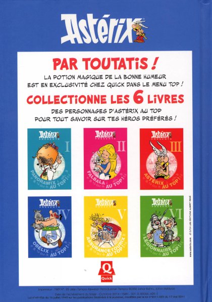 Obélix au top ! est le volume 4 de la série Astérix Présente (Publicitaire Quick) par Albert Uderzo, paru en 2014. Selon nos informations, il n'en existe qu'une seule édition, publiée par Albert René.