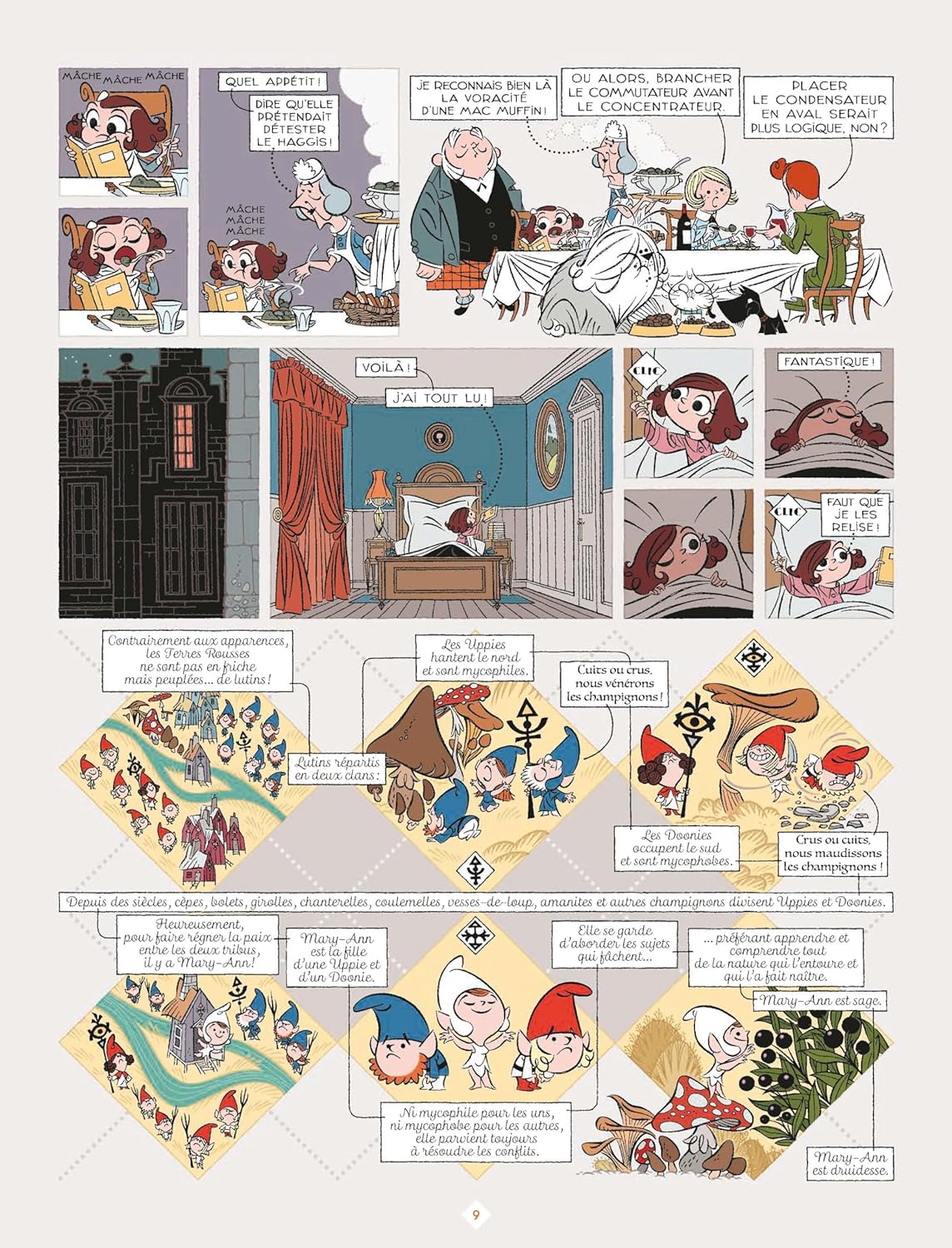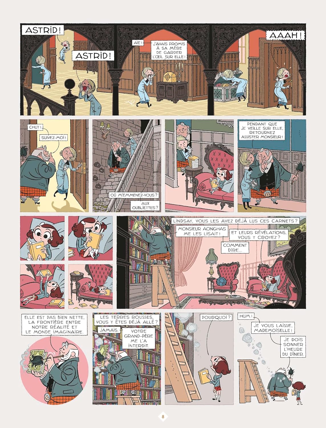 Madame Poppyscoop, qui accompagne Astrid pour son séjour, se trouve entraînée dans le sillage de la curiosité de leur hôte, laissant la jeune fille dans une situation d’ennui ferme. Dans l’immense bibliothèque du manoir, elle met alors la main sur les carnets de voyage de son grand-père Aonghas Mac Muffin, qui traitent des personnages et créatures mythiques de la région. Elle y découvre les lutins des Terres Rousses qui aussitôt la fascinent.