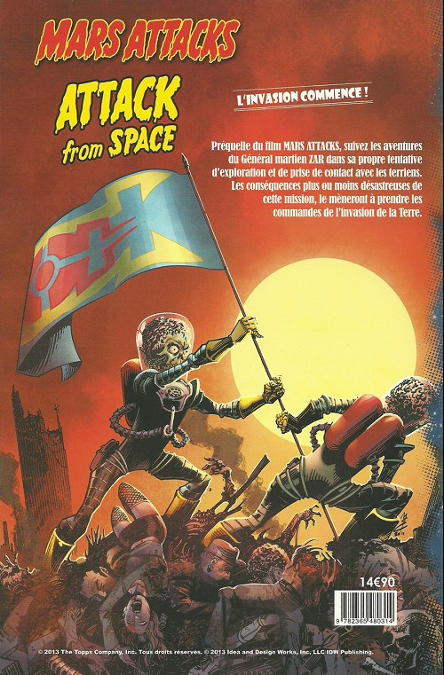 Préquelle du film MARS ATTACKS, suivez les aventures du Général martien ZAR dans sa propre tentative d’exploration et de prise de contact avec les terriens. Les conséquences plus ou moins désastreuses de cette mission le mèneront à prendre les commandes de l’invasion de la Terre. Sous la plume de John Layman (Chew) et sous le crayon de John McCrea, voici une nouvelle approche de l’univers de MARS ATTACKS avec un point de vue orienté sur les martiens, qui nous permet à la fois de mieux comprendre le film, mais également de nous projeter dans un monde fantastique et loufoque encore plus riche.