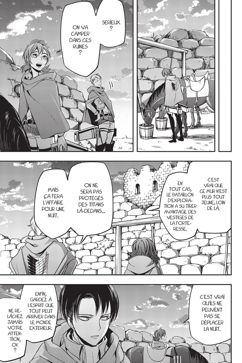 Livaï et ses amis sont en expédition hors des Murs ; c’est la grande première de la stratégie mise au point par Erwin. Mais alors que tous les soldats se félicitent de son efficacité, ils se retrouvent à la merci d’une pluie battante et d’un épais brouillard qui les empêchent de distinguer quoi que ce soit. En plein dilemme, Livaï prend une décision qui changera sa vie !