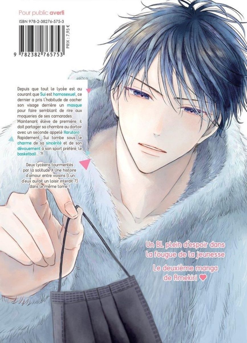 Depuis que tout le lycée est au courant que Sui est homosexuel, ce dernier a pris l’habitude de cacher son visage derrière un masque pour faire semblant de rire aux moqueries de ses camarades. Maintenant élève de première, il doit partager sa chambre au dortoir avec un seconde appelé Harutora. Rapidement, Sui tombe sous le charme de sa sincérité et de son dévouement à son sport préféré, le basketball... ?!Deux lycéens tourmentés par la solitude X Une histoire d’amour entre voisins (l’un d’eux aurait un loisir interdit ?) dans le même tome !