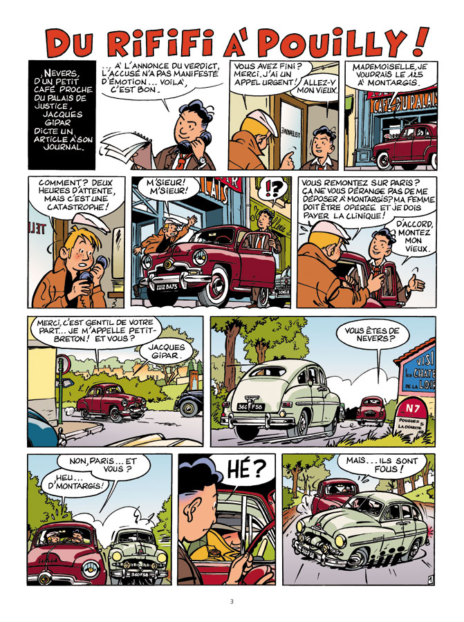 Comment Jacques Gipar et Petit-Breton se sont-ils rencontrés ? Vous le découvrirez en lisant Du Rififi à Pouilly, première des quatre histoires de ce recueil. On y découvrira aussi les amours de Petit-Breton, qui mettent nos deux héros aux prises avec la mafia italienne de la Côte d’Azur dans Dernière Séance sur la Durance. Quel est le mystère de L’Hispano Disparue ? Jacques Gipar enquête sur fond de projets autoroutiers. Enfin, Une 2CV pour Luciano leur permettra-t-elle d’échapper aux gangsters à leurs trousses ? Entre N7 et route Napoléon, Seine-et-Marne et Luberon, un album où nos héros en verront de toutes les couleurs... tout au long des routes de France !