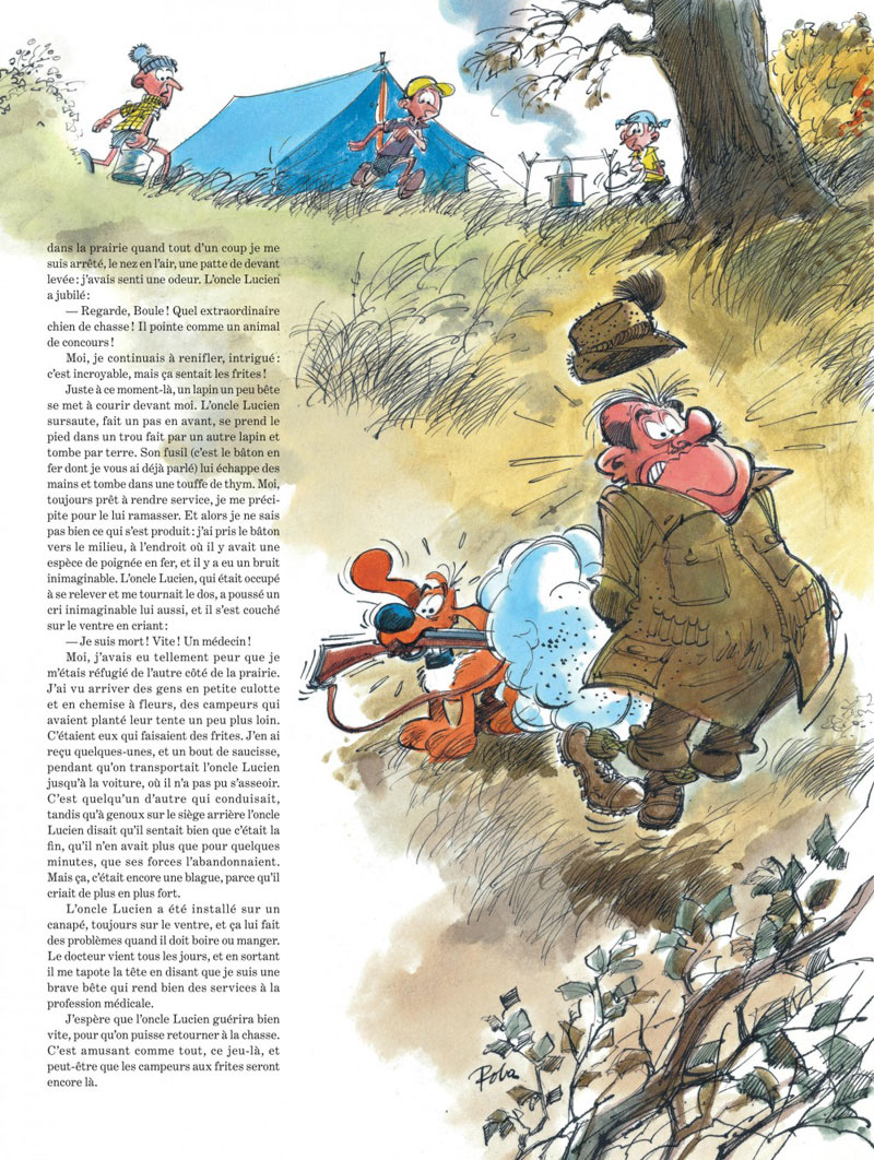Yvan Delporte, célèbre rédacteur en chef de Spirou, est notamment connu pour d’illustres collaborations : il travaille avec Peyo sur les meilleurs scénarios des Schtroumpfs, aidera Franquin à créer Gaston. Et sera l’auteur derrière la mythique chronique "En direct de la rédaction" qui narrait les aventures du gaffeur le plus connu de la bande dessinée. Une autre chronique qu’il animera avec bonheur entre 1967 et 1977 sera "L’Avis de chien de Bill". Il écrira 32 histoires, que Roba illustrera de magnifique manière, employant tour à tour l’aquarelle couleur ou le lavis, rappelant la force graphique dont il est capable. En 2005, une 33ème chronique est rédigé par Delporte et illustrée par Verron en hommage à Roba. Drôles et impertinentes, incisives et cocasses, ces histoires se lisent sur plusieurs niveaux. Pour les enfants, comme des gags racontés par le meilleur ami du petit garçon qu’est Boule, et pour les adultes comme des commentaires drolatiques sur nos petits travers.