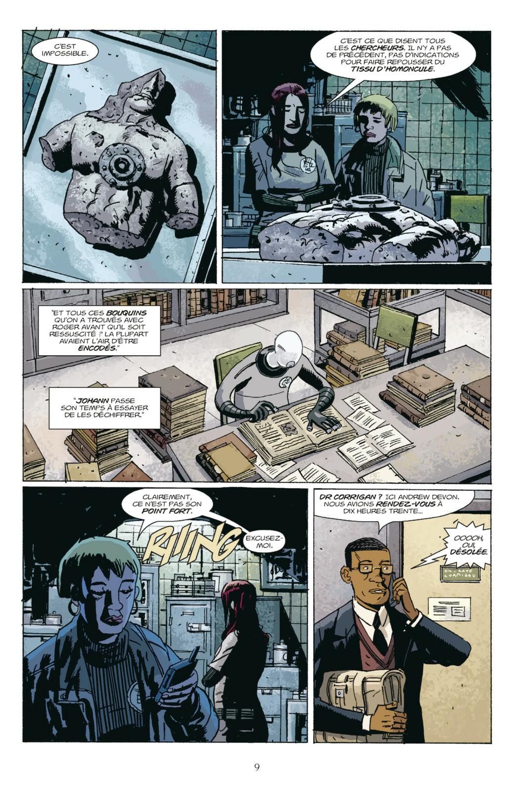 Après le cataclysme causé par Katha-Hem, demi-dieu invoqué par la Flamme noire, Kate Corrigan entreprend un voyage en France, à la recherche d’un ancien texte qui pourrait ressusciter Roger l’Homoncule, tué durant les événements. Au Q.G. du B.P.R.D., cette disparition renforce le lien qui unit désormais Abe, Liz, Johann et le capitaine Daymio. Tour à tour, ils livrent leur histoire et le secret de leurs origines.