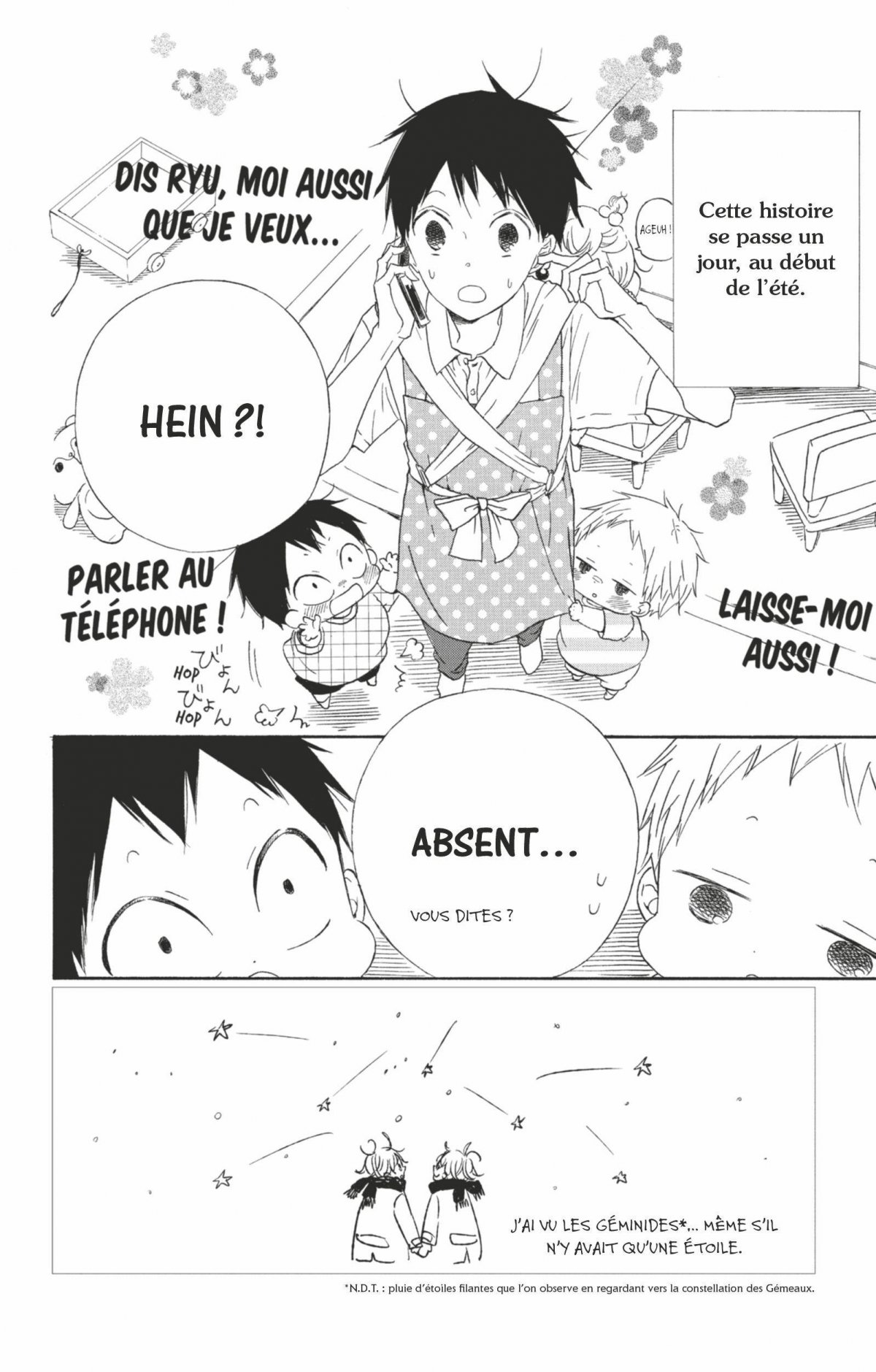 Alors qu’Usaida est est malade, un personnage inattendu vient aider à la crèche : M. Saiwaka. Mais les bébés ont un accident... Quant à Ushimaru, elle a beau s’être liée d’amitié avec Inomata, elle lui dissimule un lourd secret. Qu’adviendra-t-il de ses amours et de ses amitiés quand Ryuichi et les autres découvriront cette vérité ! Alors qu’Usaida est est malade, un personnage inattendu vient aider à la crèche : M. Saiwaka. Mais les bébés ont un accident... Quant à Ushimaru, elle a beau s’être liée d’amitié avec Inomata, elle lui dissimule un lourd secret. Qu’adviendra-t-il de ses amours et de ses amitiés quand Ryuichi et les autres découvriront cette vérité !