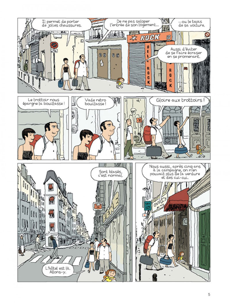 Un couple avec enfant revient en ville apres quelques années passées en pleine campagne. Meme si cela ne va pas sans mal : les agents immobiliers leur rient au nez quand ils annoncent leur budget pour une location, le monde du travail a changé, il faut apprendre beaucoup de choses a leur fille de quatre ans. Mais ils redécouvrent aussi les bonheurs simples et le confort de la vie en ville : les trottoirs qui permettent de garder ses chaussures propres ! L’éclairage la nuit ! Les parcs qui n’ont pas besoin d’etre entretenus ! Les films ! Et en V.O. si on veut ! Ah, quel bonheur que de vivre en ville...