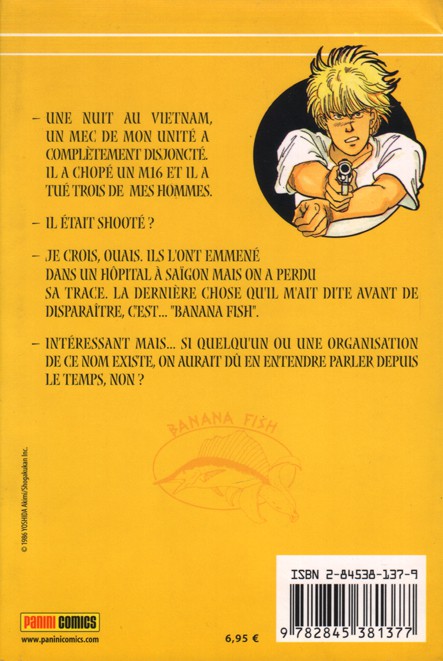 Banana Fish 1 est le volume 1 de la série Banana Fish par Akimi Yoshida, paru en 2002. Selon nos informations, il n'en existe qu'une seule édition, publiée par Panini Comics.