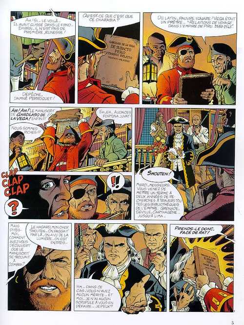 Barbe-Rouge, indifférent a cette rencontre céleste, tente de convaincre son fils de détourner le bateau vers le Pérou. Mais Eric est fatigué des magouilles de son pere. Et puis c’est un honnete homme, qui ne trahirait personne - pas meme l’odieux d’Alembert - pour tout l’Or des Incas. S’ensuivent quelques meurtres et une mutinerie orchestrée par Barbe-Rouge..