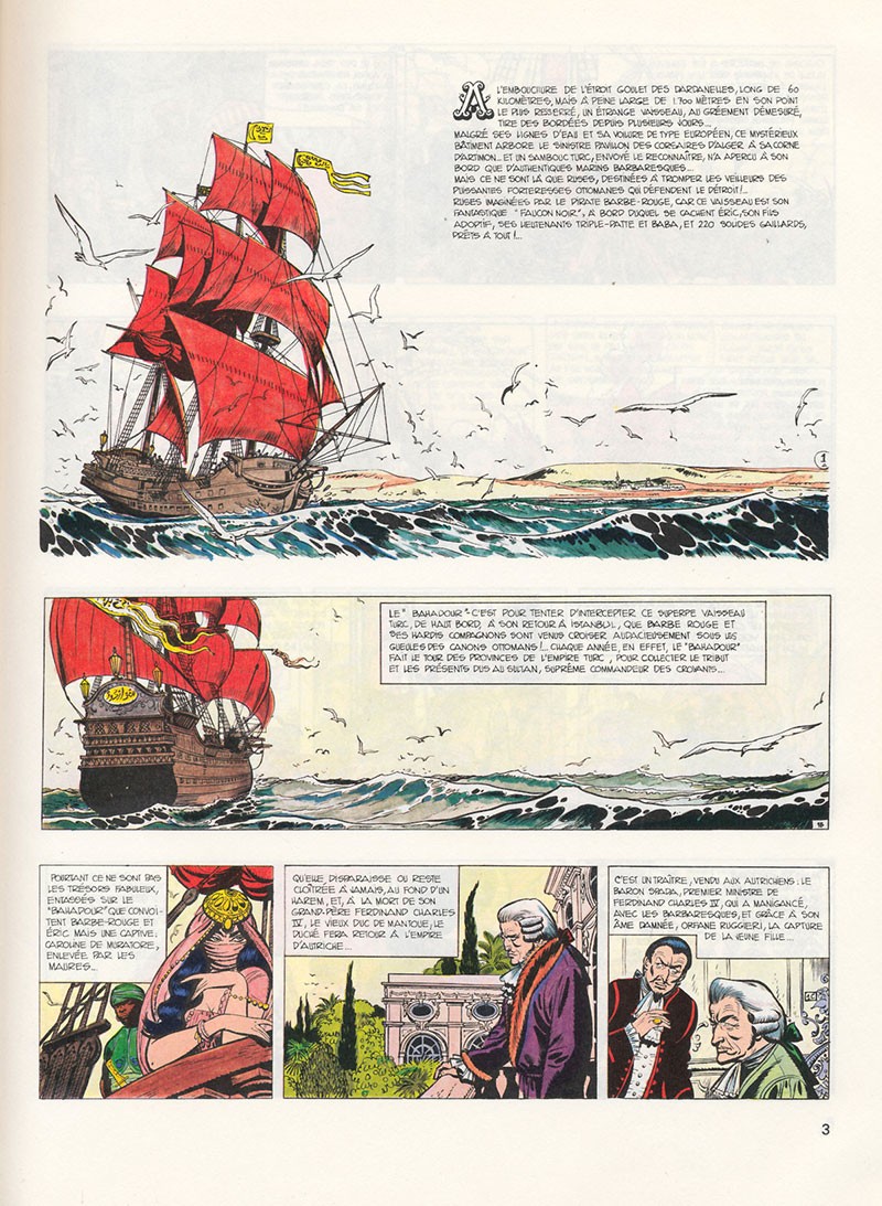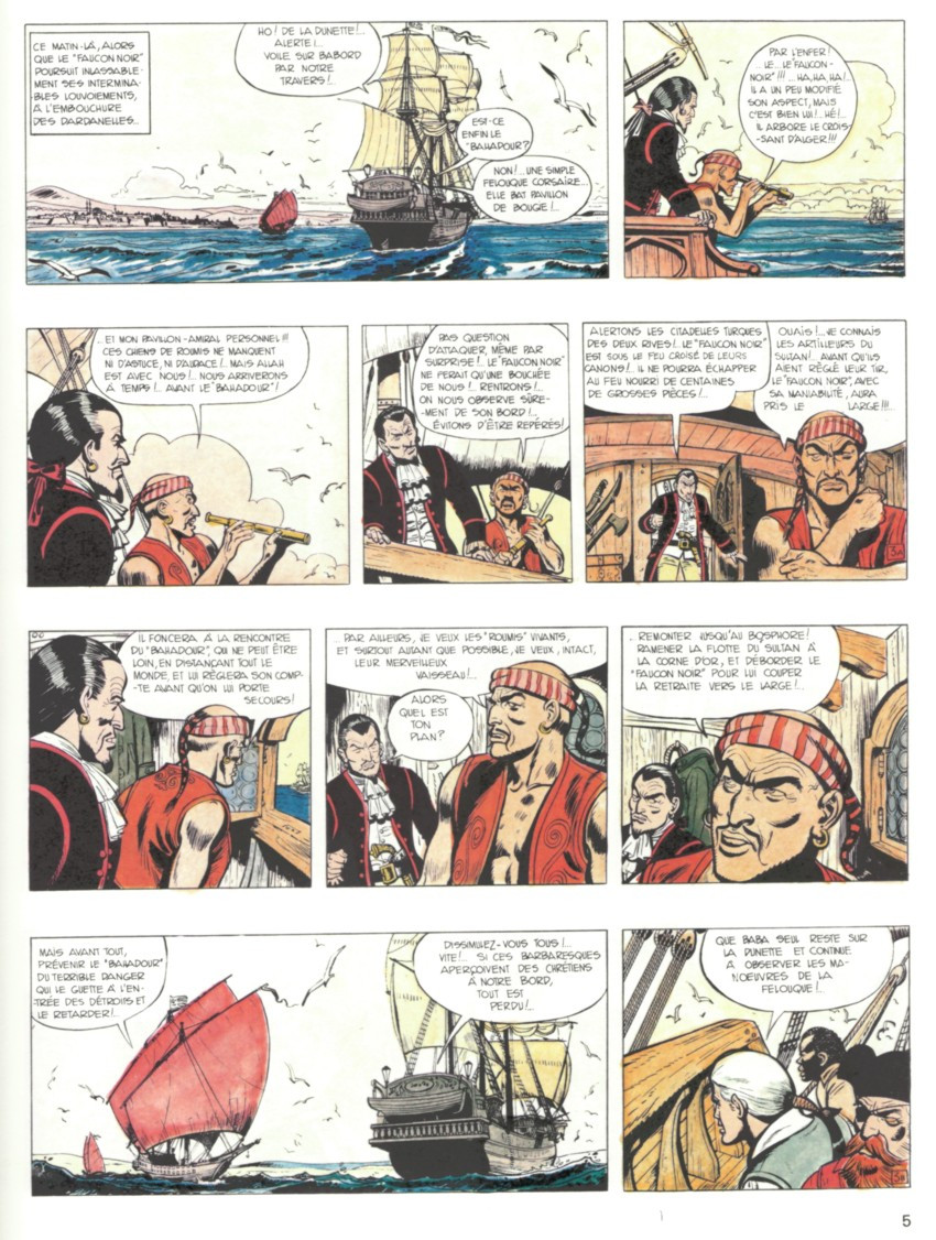 Celui-ci, pourtant, est intercepté par Barbe-Rouge. Mais Caroline, la veille, a été transférée sur la felouque de Kaïr. Barbe-Rouge et son équipage se déguisent en Turcs. A bord du Bahadour qui remorque le Faucon Noir -faussement capturé-, ils entrent dans le port d’Istambul.