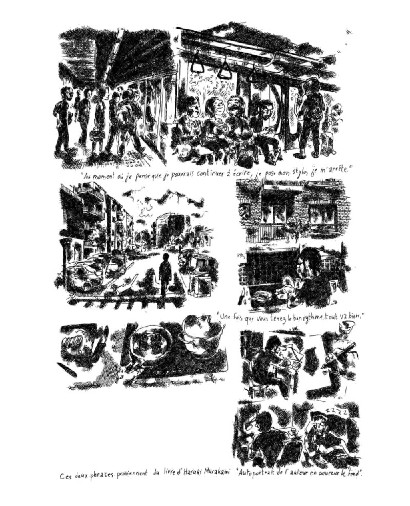 Ces deux anecdotes, seulement liées par leur protagoniste, se mélangent dans Barbecue, ou plutôt se fondent l’une dans l’autre comme dans un moment d’absence. Si le livre retrace avec précision deux moments vécus, le dessin de Bertrand Panier est le sujet même du livre. Les hachures fines qui saturent la surface de la planche font naître un espace indécis, à la fois profond et tout en surface. Les événements décrits par le récit deviennent, grâce au traitement graphique, à la fois des anecdotes légères et moments universels.