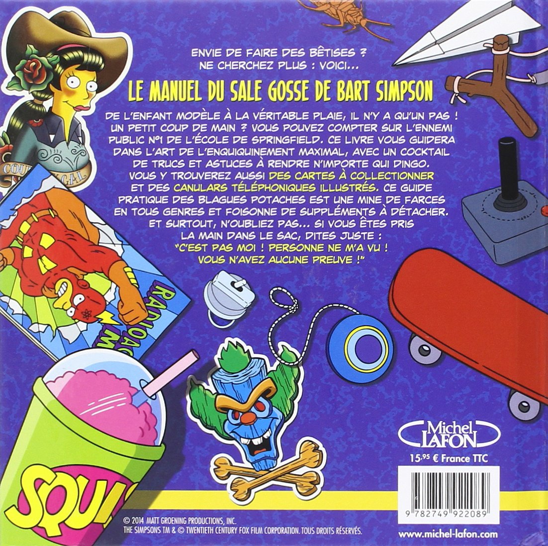 De l’enfant modèle à la véritable plaie, il n’y a qu’un pas. Pour y arriver, tu peux compter sur l’Ennemi public N°1 de l’école de Springfield, Bart Simpson en personne ! Ce livre te guidera dans l’art de l’enquiquinement maximal, avec un cocktail de trucs et astuces à rendre n’importe qui dingo. Tu y trouveras aussi des cartes à collectionner, de superbes autocollants pour skateboards et des blagues téléphoniques illustrées. Ce guide pratique des blagues potaches est une mine de bêtises en tous genres et foisonne de suppléments à détacher. Et surtout, n’oublie pas, mec... si tu es pris la main dans le sac, répète cette simple phrase : « C’est pas moi ! Personne ne m’a vu ! Vous n’avez aucune preuve ! » Écrit par Bart en personne, voici un manuel du sale gosse prêt à l’emploi en toutes circonstances, pour devenir un véritable cauchemar en famille ou à l’école