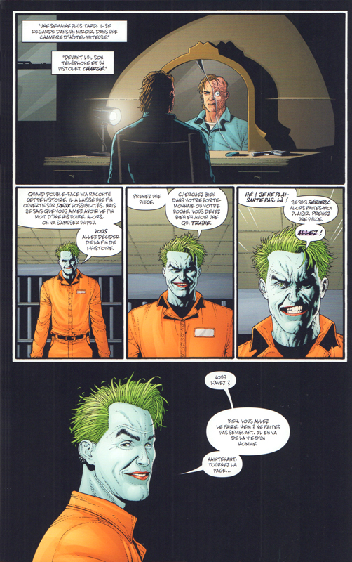 Autrefois procureur au physique avenant et à la carrière prestigieuse, Harvey Dent est désormais un être défiguré, fou et dangereux, utilisant une pièce à la face rayée pour influencer ses choix et sa carrière criminelle. Pour Batman, il est l’un des pires échecs de sa carrière : un allié passé du côté obscur. Il est aussi un avertissement : combien de temps le Chevalier Noir pourra-t-il tenir face à une société résolument corrompue