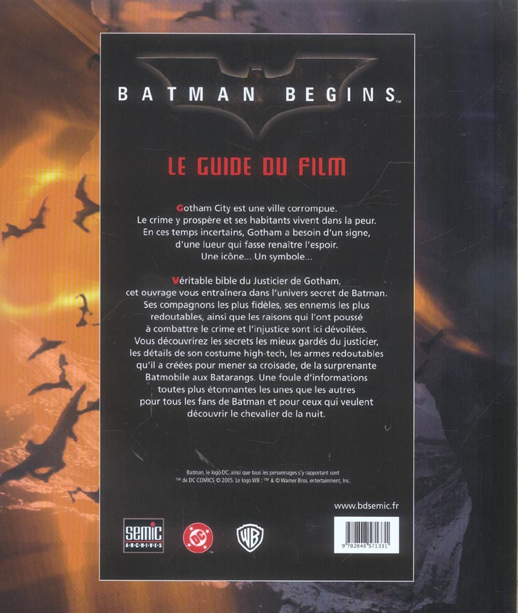Gotham City est une ville corrompue. Le crime y prospère et ses habitants vivent dans la peur. En ces temps incertains, Gotham a besoin d’un signe, d’une lueur qui fasse renaître l’espoir. Une icône... Un symbole... Véritable bible du Justicier de Gotham, cet ouvrage vous entraînera dans l’univers secret de Batman. Ses compagnons les plus fidèles, ses ennemis les plus redoutables, ainsi que les raisons qui l’ont poussé à combattre le crime et l’injustice sont ici dévoilées. Vous découvrirez les secrets les mieux gardés du justicier, les détails de son costume high-tech, les armes redoutables qu’il a créées pour mener sa croisade, de la surprenante Batmobile aux Batarangs. Une foule d’informations toutes plus étonnantes les unes que les autres pour tous les fans de Batman et pour ceux qui veulent découvrir le chevalier de la nuit.