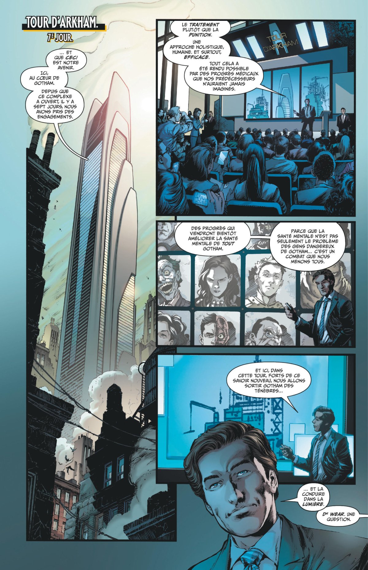 L’asile d’Arkham est tombé et, avec lui, son histoire sombre et tordue. Mais pour le remplacer, une nouvelle institution - la tour d’Arkham - est érigée en plein coeur de Gotham sous l’impulsion du Dr. Wear. Celui-ci promet que ses méthodes et ses traitements pourront en finir une bonne fois pour toutes avec les comportements psychotiques et criminels qui rongent la cité maudite - des promesses accueillies avec la plus grande méfiance par la Bat-famille. Et avec Batman loin de la cité, ce sera à ses co-équipiers de démêler le vrai du faux, et d’agir avant que la situation ne devienne... explosive