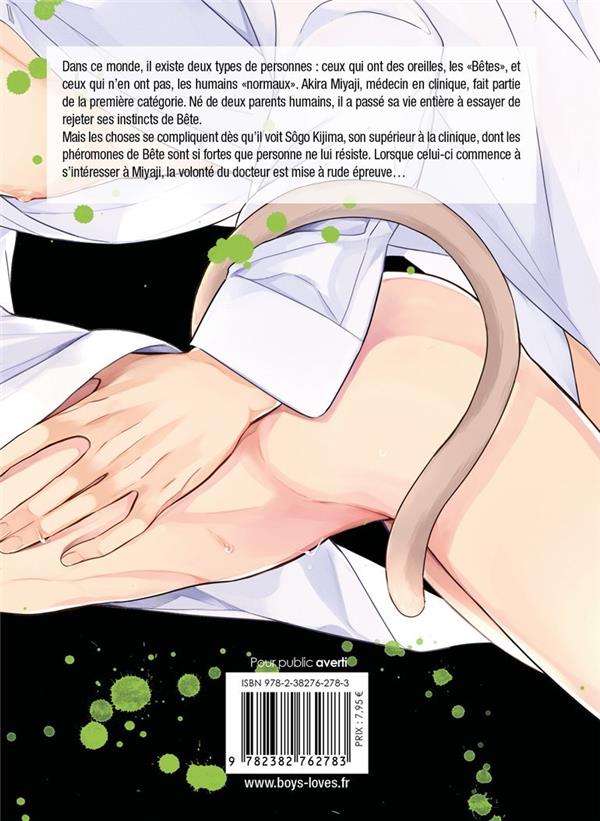 Dans ce monde, il existe deux types de personnes : ceux qui ont des oreilles, "les Bêtes", et ceux qui n’en ont pas, les humains "normaux". Akira Miyaji, medecin en clinique, fait partie de la première catégorie. Né de deux parents humains, il a passé sa vie entière à essayer de rejeter ses instincts de Bête. Mais les choses se compliquent dès qu’il voit Sôgo Kijima, son supérieur à la clinique, dont les phéromones de Bête sont si fortes que personne ne lui résiste. Lorsque celui-ci commence à s’intéresser à Miyaji, la volonté du docteur est mise à rude épreuve...